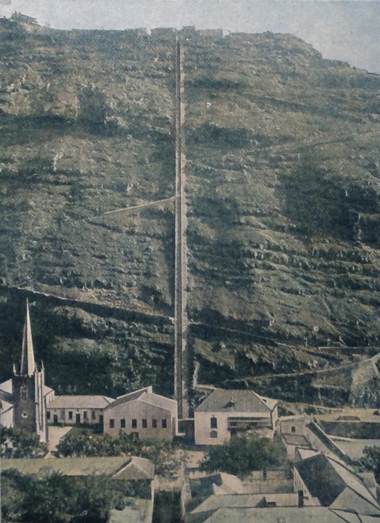 Unsere Bilder zeigen den von zwei Forts geschützten Hafen der Hauptstadt von St. Helena und diese Hauptstadt selbst mit ihrer neuen Straße, die am Nordrand der Insel in eine enge Felsenschlucht eingezwängt ist. Für die Negerbevölkerung, die den überwiegend größten Teil der Einwohner ausmacht, ist es zu umständlich, die Schlangenlinien der Fahrstraße abzulaufen, die den Verkehr der Stadt mit dem Hochplateau des Insellandes vermittelt; sie steigen deshalb auf künstlichen Aufzügen, wie unser Bild zeigt, zur Höhe oder vom Hochland zum Hafen.