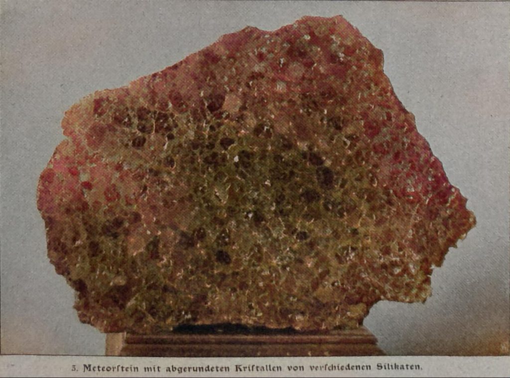 Die Meteorite zerfallen in zwei Hauptgruppen, die Steinmeteorite und die „Eisen“. Die ersteren bestehen hauptsächlich aus Silizium mit wenig oder gar keinem Eisengehalt, die andern aus gediegenem Eisen, das immer mit Nickel „legiert“ ist. Die „Steine“ haben oft eine frappante Aehnlichkeit mit vulkanischen Produkten, und zwar hauptsächlich mit den Tuffen unserer Feuerberge, jenen zusammengewürfelten und zusammengeschmolzenen Schuttmassen, die von vielfach wieder durch Schmelzung abgerundeten Kristallen von Olivin und andern Silikaten erfüllt sind. Abb. 3 zeigt einen solchen Meteoriten. Es gibt nun die mannigfaltigsten Uebergänge von den „Steinen“ zu den „Eisen“. Anderseits hat man in neuerer Zeit ganz reine Silikate, vollkommene Gläser, als Meteorite erkannt. Es sind die sogenannten Moldavite, die genau wie gewöhnliches grünes Glas aussehen. Sie sind von ganz besonderer Härte, fast unschmelzbar und können in unseren Glasfabriken gar nicht hergestellt werden. Dennoch blieb man lange über sie im Zweifel, bis auch in Australien ein großes Gebiet aufgefunden wurde, über das ein offenbar vor sehr langer Zeit stattgehabter Meteoritenfall Tausende solcher „Bouteillensteine“ ausgestreut hat, wo es ganz gewiß niemals Glasfabriken gab.