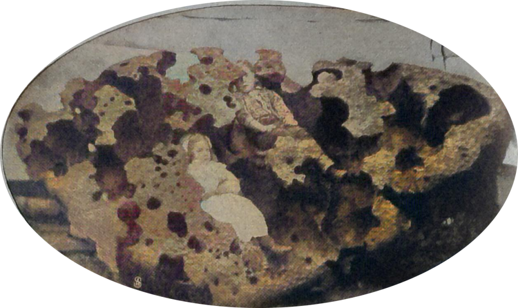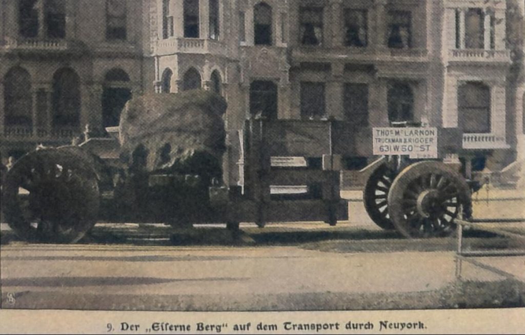 Es soll in Diamant übergehenden Graphit enthalten, wie man es auch in andern kosmischen Eisenmassen gefunden hat. Die größte dieser Eisenmassen ist aber der aus seinem sagenumwobenen Dunkel jetzt ans Licht gezogene „Eiserne Berg“ der grönländischen Eskimos, die sich aus Splittern von ihm eiserne Waffen machten. Schon Kapitän Roß hatte 1818 von ihm gehört, aber erst dem unermüdlichen Polarreisenden Leutnant Peary gelang es, ihn zu finden und nach mehreren vorbereitenden Reisen mit unsäglichen Schwierigkeiten aus dem Eis der Melvillebucht zu befreien und nach Neuyork zu transportieren. Abbildung 9 zeigt das kosmische Ungeheuer, wie es am 3. Oktober des vergangenen Jahres seinen Einzug in Neuyork hält, und Abbildung 6 gibt es noch einmal größer wieder. Einen andern sehr eigentümlichen Eisenmeteoriten hat man im Herbst 1902 in Oregon gefunden, der 13 500 Kilo wiegt. Seine eigentümlich zerfressene Gestalt hat er jedoch sicher nicht beim Fall erhalten, sondern durch Auswitterung. In den Lücken befand sich wahrscheinlich ursprünglich Schwefeleisen, wie man es von andern Meteoreisen kennt. Dieses ist der Auslaugung viel leichter ausgesetzt als das gediegene Eisen. Um das Größenverhältnis des Blocks (Abb. 7) zum Ausdruck zu bringen, hat man bei der Aufnahme Kinder in die Aushöhlungen gesetzt.