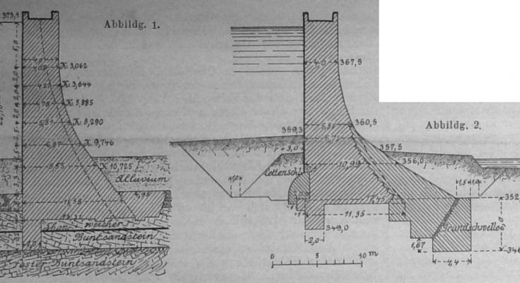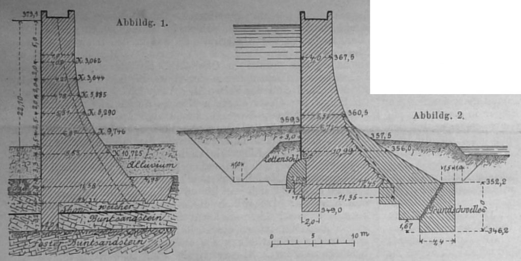 Ungeachtet der Fehler, die bei der Profilbestimmung vorgekommen sind, hätte die Sperre vermöge der hohen Sicherheits-Koeffizienten, welche bei Mörtel- und Steinfestigkeiten allgemein angewendet werden, ihre Standfestigkeit vielleicht bewahren können, wenn nicht ein grober Fehler auch bei ihrer Gründung vorgekommen wäre. Der Boden zeigt an der Stelle der Sperre wechselnde Schichtung und ist überhaupt nicht von günstiger Beschaffenheit. Zu oberst liegt eine 3,3 m starke Lage von Alluvium, darunter 2,8 m hoch Schiefer, darnach folgend weicher und zerklüfteter Buntsandstein, in welchem noch dazu eine Thonschicht eingebettet liegt. Erst in etwa 10 m Tiefe geht der weiche Buntsandstein in festes Gestein über. Bei dieser Zusammensetzung des Bodens wäre es unbedingt nothwendig gewesen, mit der Fundamentsohle etwas mehr als 10 m tief hinabzugehen. Vermuthlich aus falsch angewendeter Sparsamkeit hat man dies unterlassen, vielmehr die Fundamentsohle in den oberen Theil der weichen und undichten Buntsandsteinschicht gelegt. Aber nicht nur das, sondern es ist der weitere Fehler begangen worden, die Fundamentsohle in grosse Nähe der eingelagerten Thonschicht zu bringen. Als Mittel gegen das Durchsickern von Wasser unter der Sohle ist bei den französischen Ingenieuren die Anlage einer kleinen sogen. Dichtungsmauer am vorderen Fuss der Sperre beliebt; dieselbe ist nach Abbildg. 1 auch bei der Sperre von Bouzey ausgeführt.