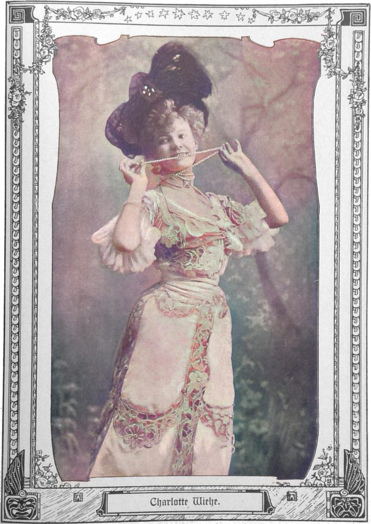 Charlotte Wiehe ist in Kopenhagen geboren und gehörte dem Ballett der dänischen Hofoper an, trat dann in Salonkomödien Operetten auf, bis sie in Paris unter Cherès Leitung sich auf die Pantomime verlegte.