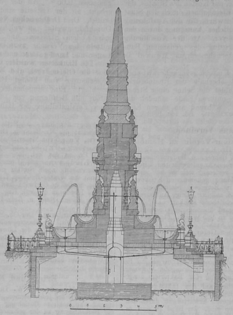 Da die Abbildung nur die Formen des Bauwerkes erkennen lässt, so sei hier erwähnt, dass die Treppenstufen aus röthlich grauem Sandstein – Bruch Hachstätten -, die Brunnenschalen aus blassrothem Sandstein – Bruch Weidenthal -, die Säulenschäfte und der Mauergrund hinter den Reliefmedaillons aus dunkelrothem Sandstein – Bruch Kaiserslautern – alles übrige aus gelblich weissem Sandstein – Bruch Königsbach hergestellt wurden. Nur zu den Postamentsteinen der Einfriedigung wurde ausserpfälzisches Steinmaterial, nämlich röthlicher Granit aus dem Odenwalde, verwendet. Die Medaillons, die Wappenschilder, die Nischeneinsätze, die Delphine usw. wurden mit bescheidener Vergoldung in Galvanobronze ausgeführt.