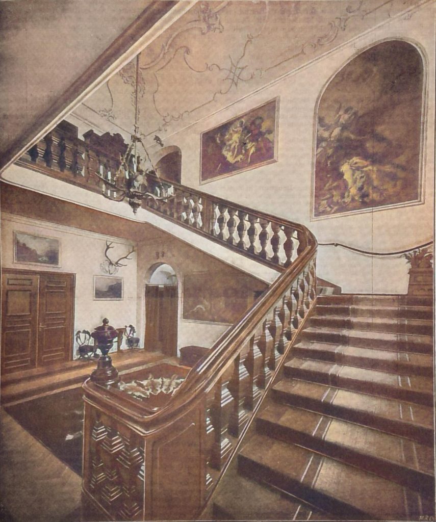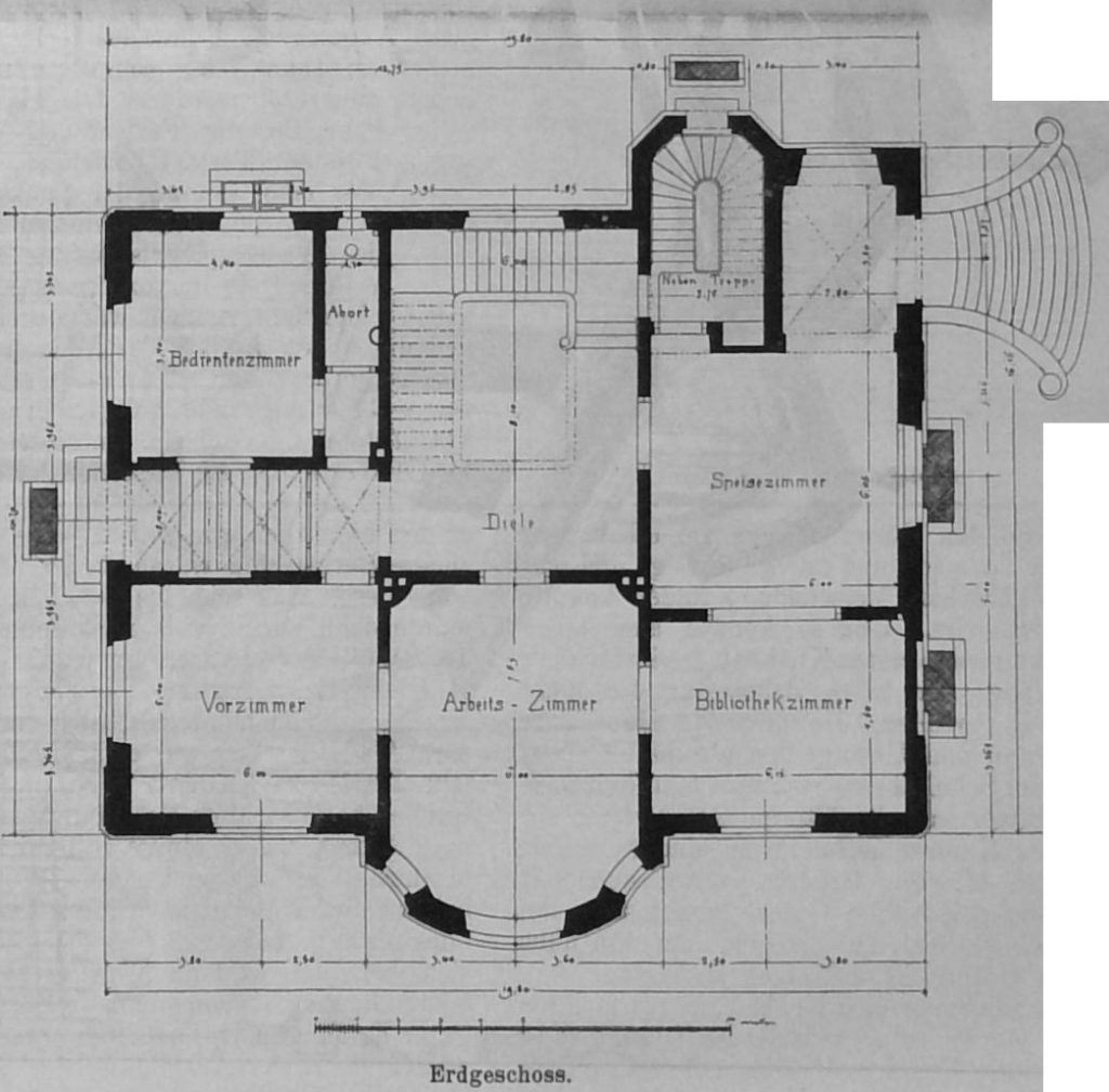 Einer besonderen Beschreibung wird es weder für die Grundriss-Anordnung, noch für den Aufbau des Hauses bedürfen. Inbezug auf die erste sei bemerkt, dass sich im Untergeschoss die Küche und die Wirthschafts-Räume, im Dachgeschoss Fremdenzimmer und Räume für die Dienerschaft befinden. Die Fassade ist als Putzbau in den Formen jenes Barockstils süddeutscher Färbung gestaltet, in den sich der Architekt – wie vielleicht kein zweiter Künstler – eingelebt hat und dessen Berechtigung von ihm in der von uns wiedergegebenen Aeusserung dargelegt wird.