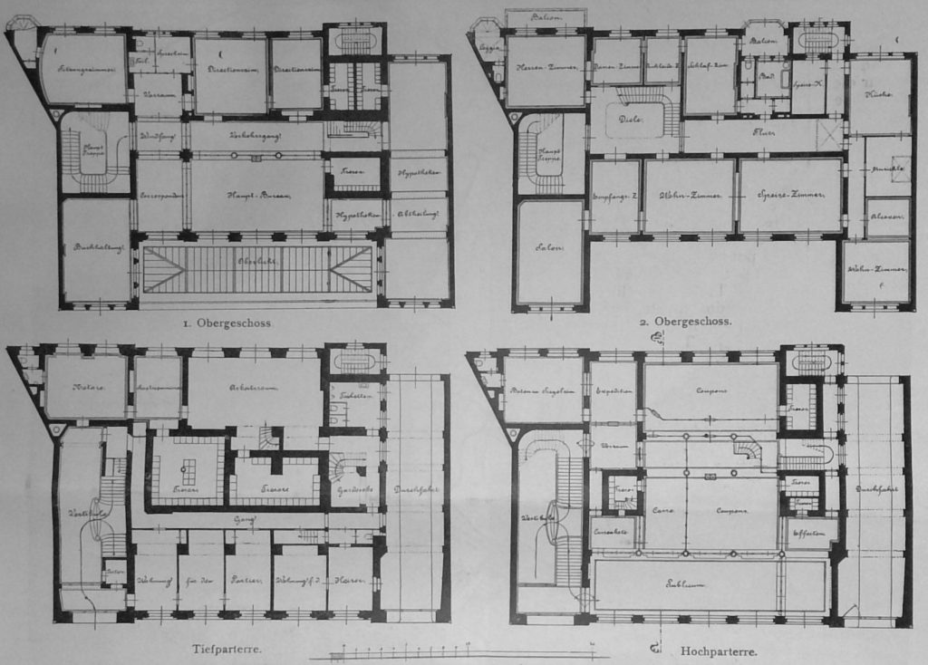Im Hochparterre gruppiren sich um den an der Strassenfront belegenen Publikumraum die sämmtlichen Kassen, von denen jede ihren besonderen Tresor besitzt. Das oberhalb der Durchfahrt liegende Zwischengeschoss enthält ausreichende Garderoben- und Toilettenräume, sowie ein Frühstückszimmer für die Beamten. Im I. Obergeschoss sind die Direktionsräume, das Sitzungszimmer.nebst den nöthigen Vor- und Sprechzimmern, sowie die internen Büreaus der Bank untergebracht. Im II. Obergeschoss ist die Wohnung für einen Direktor angeordnet, deren Neben-Räumlichkeiten im Dachgeschoss liegen.