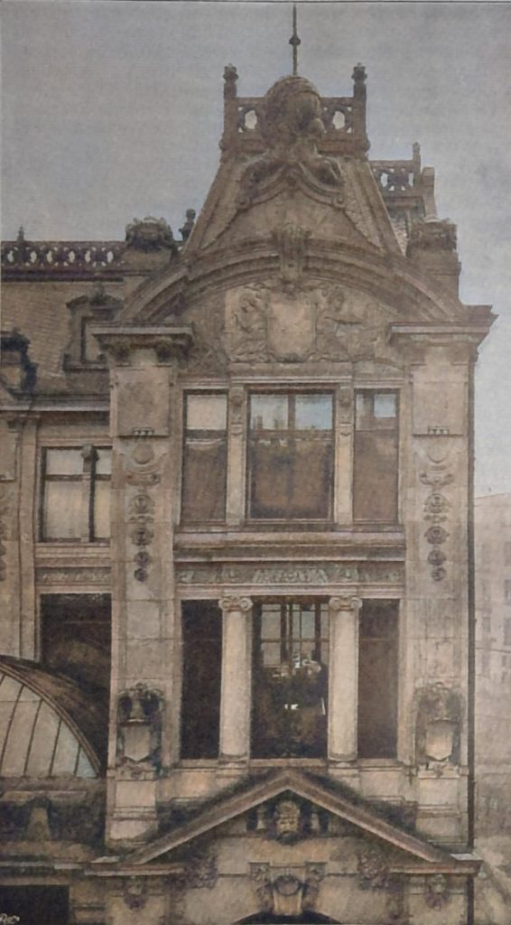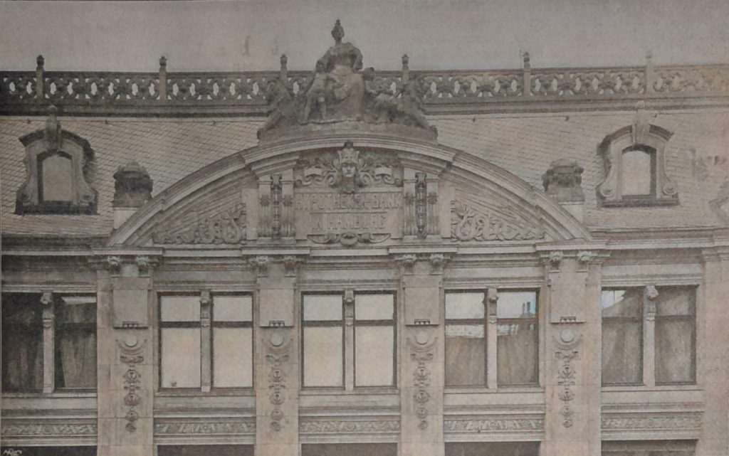 An technischen Einzelheiten sei folgendes erwähnt: Sämmtliche Geschosse einschl. des Dachgeschosses sind feuersicher konstruirt und es ist insbesondere der Lage und Konstruktion der Tresors hohe Beachtung geschenkt. Die Tresorbauten sind nicht, wie gewöhnlich, für alle Abtheilungen vereint in ein Geschoss gelegt, sondern durch alle drei zu Bankzwecken benutzten Geschosse durchgeführt, wodurch ermöglicht wird, dass jede einzelne Abtheilung ihren besonderen Tresor erhält. Die Sicherungen der Wände, Decken, Fussböden und Thüren der Tresore sind nach den neuesten im Bankbau gemachten Erfahrungen hergestellt. In den beiden Hauptgeschossen sind die Tresore zur besseren Ausnutzung in der Höhe nochmals getheilt; die hierdurch entstehenden Zwischengeschosse sind von den Podesten der internen Geschäftstreppe aus zugänglich. Die im Stile der italienischen Hoch-Renaissance gehaltene Fassade ist im Sockel aus Granit. in den übrigen Theilen aus Burgpreppacher Sandstein von der Firma Ph. Holzmann & Co. ausgeführt. Die Figurengruppen sind nach den Modellen des Hrn. Prof. Brütt-Berlin gefertigt, während die Modelle zu dem ornamentalen Schmuck der Fassade von Hrn. Bildhauer H. Giesecke daselbst herrühren. Die örtliche Bauleitung war Hrn. Architekt R. Bielenberg aus dem Atelier des Hrn. Martens übertragen.