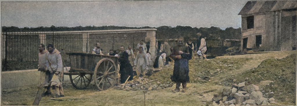 Hierzu 6 photographische Aufnahmen von Mr. Dubouloz. Inmitten der blühenden Fluren des Departements Orne, jenes Teils der Normandie, der an Fruchtbarkeit der Touraine, dem „Garten Frankreichs“, kaum nachsteht, erhebt sich starr und einsam ein düsteres Gebäude. Der massige, langgestreckte Bau erscheint mit seinen vielen Fenstern fast wie eine Stätte, wo unruhige Arbeit rastlos für den Erwerb wirkt und schafft; aber der hochragende Kirchturm, der sich weithin sichtbar in die Lüfte reckt, ist ein Zeichen, daß die Gäste des Hauses eine andere Sorge haben als die Jagd nach irdischen Gütern. Ringsum in der weiten Ebene herrscht tiefes Schweigen. Nur das dumpfe Brüllen weidender Rinder oder der schwermütige Ton ferner Kirchenglocken unterbrechen die bange Stille.
