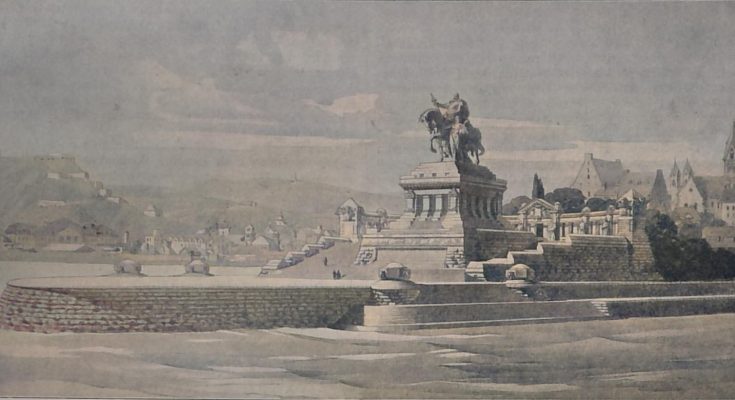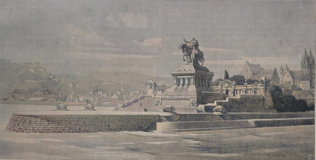 Verhältnissmässig lange hat es gedauert, ehe der schon i. J. 1888 gefasste Beschluss des rheinischen Provinzial-Landtages auf Errichtung dieses Denkmals verwirklicht worden ist. Und zwar waren es hier, wie überall, die Meinungs-Verschiedenheiten über den für dasselbe zu wählenden Standort, welche als schwer zu überwindendes Hinderniss sich geltend machten. Da für eine solche Wahl in erster Linie künstlerische Gesichtspunkte inbetracht kommen müssen – bekanntlich hat man denselben anderwärts zum Schaden der Sache nicht immer genügendes Gewicht beigelegt – so entschloss man sich, zunächst die Vorschläge der Künstler über diesen Punkt entgegen zu nehmen. Man schrieb daher i. J. 1889 für den Entwurf des Denkmals einen öffentlichen Wettbewerb aus, bei dem die Art und der Standort desselben – ob auf einer Uferhöhe des Rheins oder einer Rheininsel – dem Ermessen der Theilnehmer überlassen blieben. Unter den öffentlichen Stimmen, die sich zu der Angelegenheit hören liessen, befürworteten die meisten einen Platz im Siebengebirge; doch fehlte es auch nicht an solchen, denen vor allem die leichte Zugänglichkeit des Denkmals am Herzen lag und die es daher in einer Stadt – nach der Lage der Dinge konnte nur Koblenz infrage kommen – errichtet zu sehen wünschten, Der Ausgang des Wettbewerbs, an dem 24 Künstler sich betheiligten, ergab, dass nicht weniger als 18 für ein Insel-Denkmal (auf einer Spitze von Grafenwerth oder Nonnenwerth), 3 für ein Höhen-Denkmal (an der Felswand des Drachenfels, auf der Erpeler Ley und dem Hardtberge) sich entschieden hatten, während seitens der 3 übrigen ein Brücken-Denkmal, ein Denkmal vor dem Koblenzer Schloss und ein solches ohne Platzbestimmung entworfen worden waren. Der Streit der Meinungen nahm indessen seinen Fortgang und erschien vielen so unlösbar, dass sogar der Vorschlag auftauchen konnte, auf die Errichtung eines Denkmals ganz zu verzichten und die dafür bestimmte Summe zur Gründung einer milden Stiftung zu verwenden.