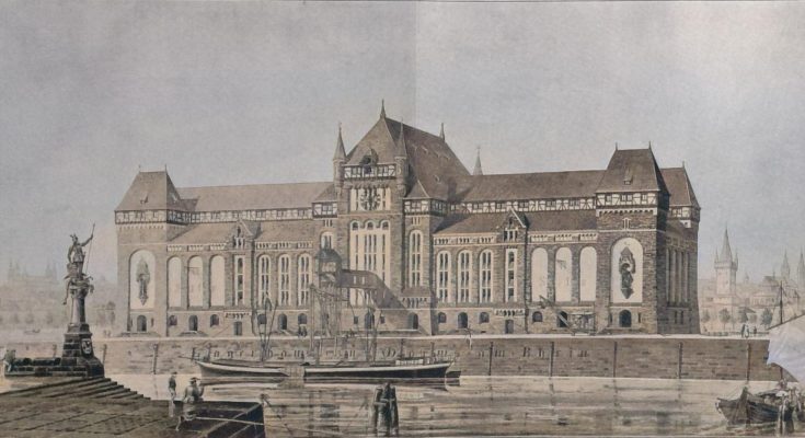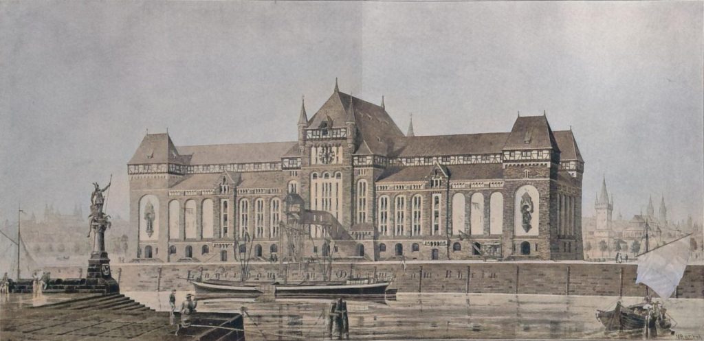 Dieselbe erfolgte in den Jahren 1887 bis 1893 durch die Ausführung von Bauten zum Schutze der Stadt gegen Hochwasser und durch eine Erweiterung der Hafenanlagen mit der hierdurch nothwendig gewordenen Verlegung und Neuanlage von Gleisen und der Errichtung neuer Hochbauten. Unter letzten verdient das nach Entwürfen des Hrn. Stadtbmstr. Ludwig Hofmann errichtete und in der Bildbeilage zur Ansicht gebrachte neue Lagerhaus seiner ausgezeichneten stilistischen Behandlung wegen, durch die es ein Vorbild für die künstlerische Ausbildung von Nutzbauten geworden ist, besondere Aufmerksamkeit.