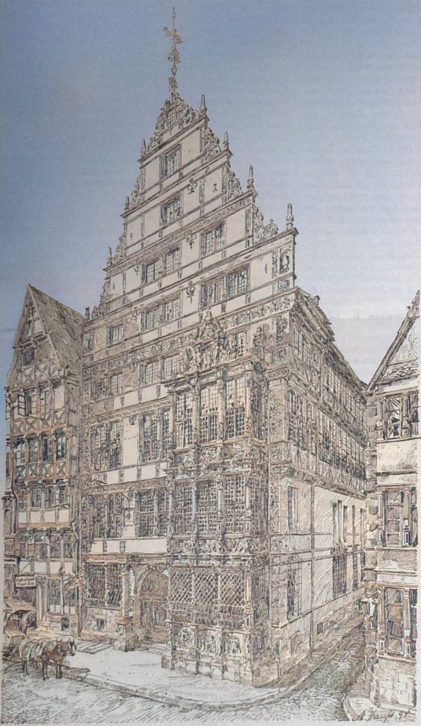 Zum Verständniss dieser ungewöhnlichen Kunstleistung in einer Zeit des tiefsten Elends in Deutschland unmittelbar nach Schluss des schrecklichsten aller Kriege ist einiges zu bemerken. Zunächst waren die Kriegswetter imganzen nur in den ersten 6-8 Jahren des dreissigjährigen Krieges über Niedersachsen dahingebraust; in ihrem weiteren Verlaufe hatten sie diese Gegenden einigermaassen verschont. Andererseits haben wir uns den genannten Krieg nicht als eine zusammenhängende Kette von Schlachten. Brandschatzungen usw. vorzustellen, sondern wie eine lose aneinander geknüpfte Folge bald bedeutender, unerheblicher Feldzüge, manche Gegenden nur einmal berührend und für die meisten jahre- ja jahrzenhtelange Ruhepausen zwischen sich 1assend, die wie sonst dem Handel und Wandel gewidmet waren. Bei dem Mangel eines Nachrichten- und Zeitungsdienstes mögen manche Gegenden Jahrzehnte lang von dem anderweit hausenden Schrecken nicht viel gewusst haben.