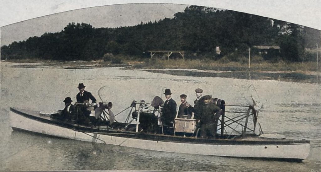 Um die praktische Verwendbarkeit seiner Erfindung zu erproben, hat Graf Zeppelin die von ihm konstruierten Luftschrauben in ein Boot einsetzen lassen. Die zur Verwendung kommenden Apparate sind dieselben, die einst dem Luftschiff Richtung und Bewegung geben sollen.