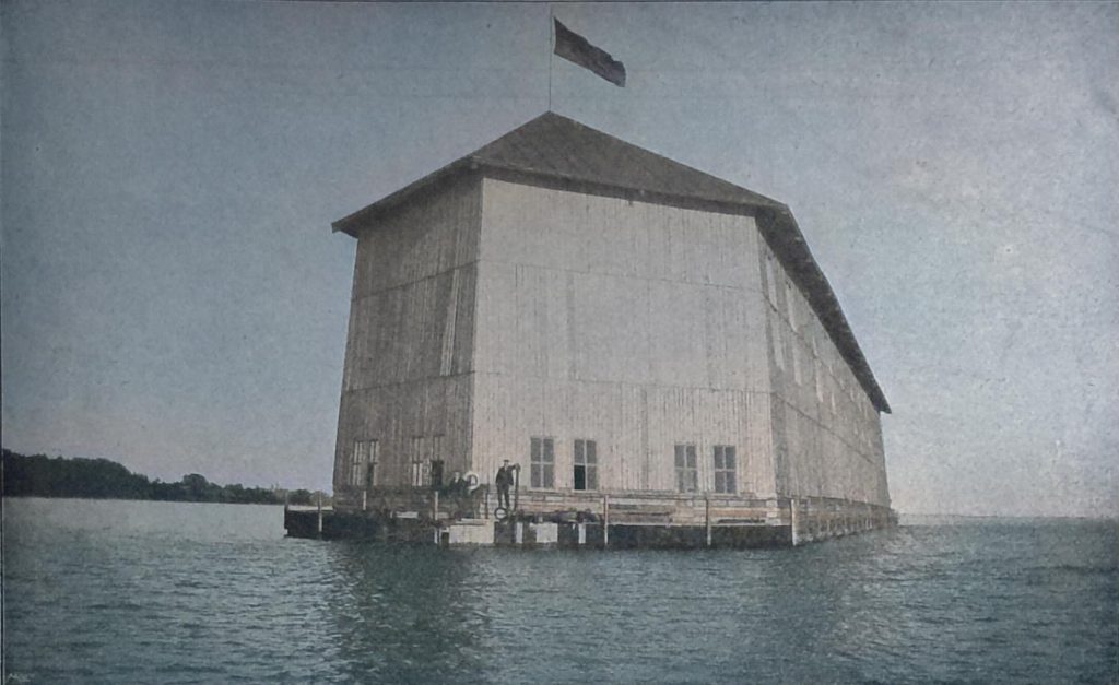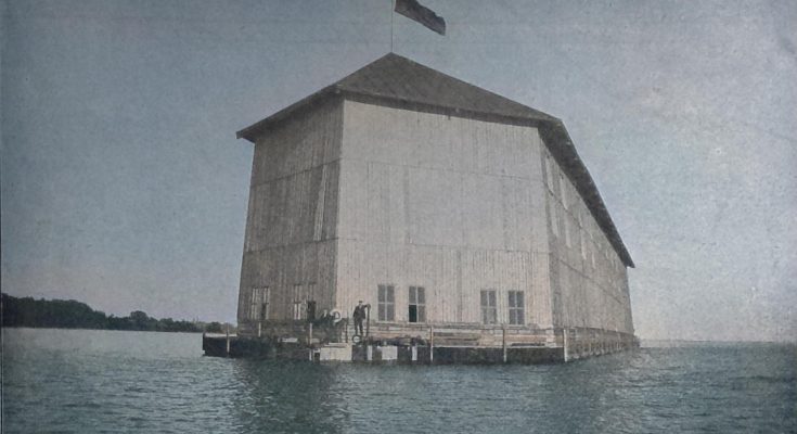 Immer wieder tauchen Erfinder auf, die ihr Leben an die Aufgabe setzen, das lenkbare Luftfahrzeug zu erbauen. Augenblicklich sieht man mit Spannung der Auffahrt des vom Generalleutnant z. D. Grafen von Zeppelin konstruierten Riesenluftschiffs entgegen, die in nächster Zeit aus der wohlverschlossenen Ballonhalle inmitten des Bodensees erfolgen soll. Der große hölzerne Schuppen, die Montierungshalle für das neue Luftschiff, die wir im Bild bringen, ist etwa 140 Meter lang, 24 Meter breit und 21 Meter hoch und schwimmt auf 95 Pontons.