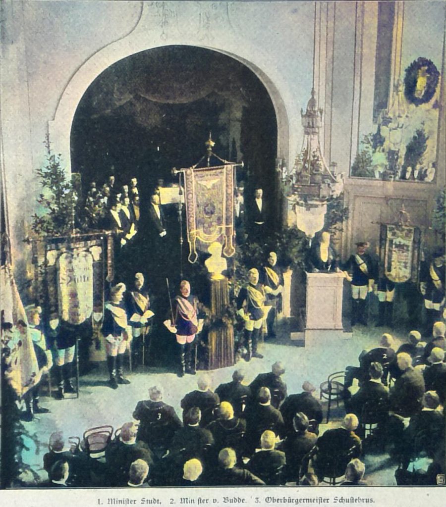 Die älteren und jüngeren Mitglieder des Vereins, die in allen Gauen Deutschlands zu finden sind, hatten sich zahlreich eingefunden, und als Ehrengäste erschienen in ihrer Mitte der Oberbürgermeister und der Stadtverordnetenvorsteher von Charlottenburg, der Rektor und viele Professoren der Hochschule, der Minister der öffentlichen Arbeiten Budde und der Kultusminister Dr. Studt, der die Grüße der Unterrichtsverwaltung überbrachte und in einer kurzen Ansprache die jungen Motiver zu Pflichttreue und Selbstbeschränkung mahnte; wenn sie im neuen Haus zu fröhlichem Thun vereinigt seien, sollten sie des alten Spruches gedenken: „Nicht zu viel.“ An seine Worte reihten sich noch viele Glückwünsche, die zum Teil von Geschenken zum Schmuck des neuen Heims begleitet waren.