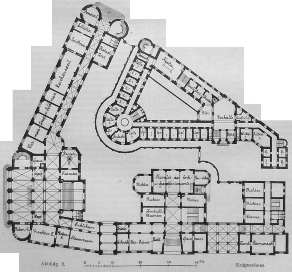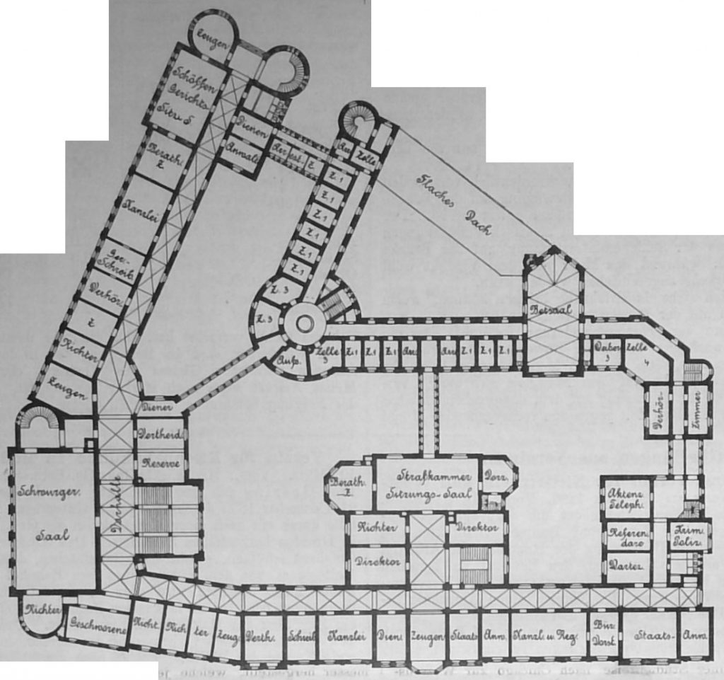 Die Beschreibung der sonstigen besonderen Gefängniss-Einrichtungen würde hier zu weit führen. Es ist selbstverständlich, dass sie durchaus den heutigen Anforderungen an Sicherheit und Gesundheit gerecht geworden sind und in dieser Beziehung auch auf der Höhe der Zeit stehen.