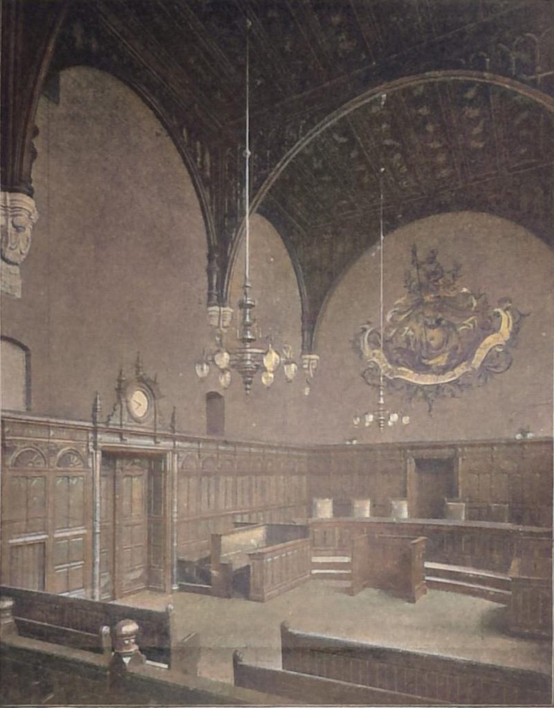 Von.den Sälen hat der Schwurgerichtssaal eine Holz-Kassettendecke erhalten, die auf einem Sandstein-Bogengesims ruht. Sie hebt sich aufs wirkungsvollste mit ihrer reichen ornamentalen Bemalung und stumpfer Vergoldung von den hell gemusterten Wandflächen ab. Einen noch kräftigeren Eindruck macht der Strafgerichts-Sitzungssaal mit seiner an englische Vorbilder erinnernden Holzbalkendecke und den Wandflächen in Backsteinfugenbau, an deren kurzen Seiten Wappen mit reichem Gehänge und frei ausflatterndem Spruchband und Blattgezweige unmittelbar auf den Backsteinuntergrund gemalt sind. In allen Sälen findet sich eine grosse Zahl auf Recht und Gericht passender Kernsprüche. Die Täfelungen der Säle – unserem Gefühl nach leider reichlich „modern“ und elegant ausgefallen – Thüren, Schränke und Möbel sind durchweg in Eichenholz ausgeführt, zum grössten Theile in höchst sauberer Arbeit, wie denn überhaupt die Ausführung überall grosse Achtung vor der Leistungsfähigkeit der Bremer Gewerkmeister abnöthigt. Die bauleitenden Künstler haben sich dabei in den Einzelnheiten vielfach nur anregend verhalten und den mit der Ausführung betrauten Meistern mehr rathgebend und Wünsche äussernd, als unbedingt fordernd zurseite gestanden. Auf diese Weise ist vielleicht ab und zu etwas zu Tage gefördert, das nicht unbedingt zu dem Vollkommenen zu zählen ist; dafür aber steckt überall im Gebäude frisches individuelles und zumtheil sehr glückliches naives Leben, frei von handwerksmässigen und technischen Schnitzern und namentlich frei von allem akademisch-büreaukratischen – auch in Architektenbüreaus herrscht heutzutage manchmal der „Kratismus“ des grünen Tisches! Schablonenthum.
