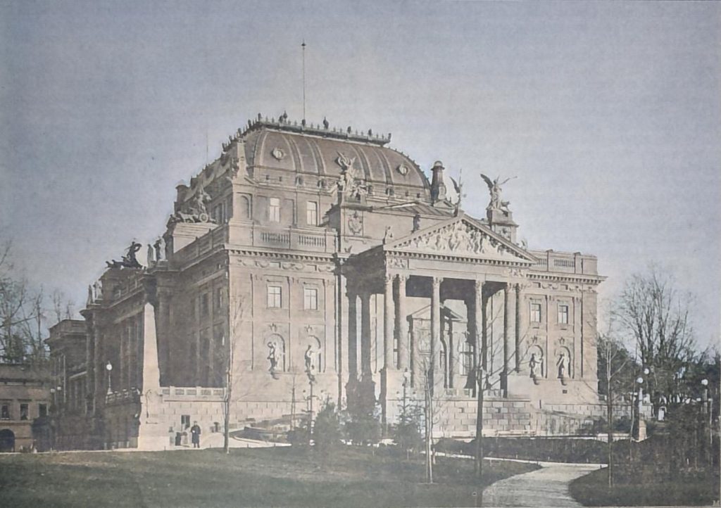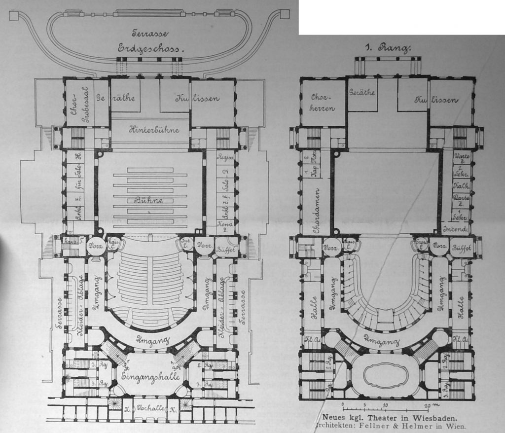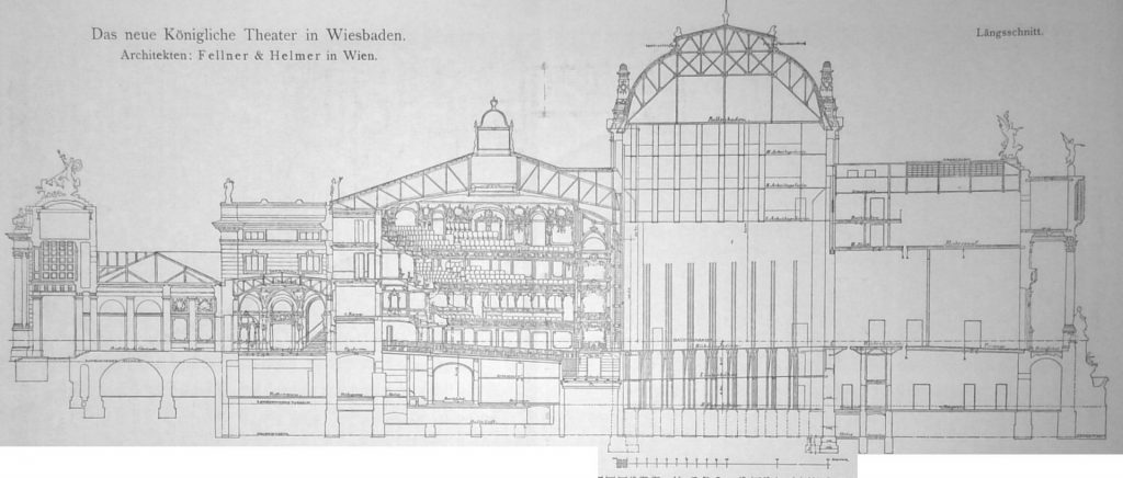 Architekten: Fellner & Helmer in Wien. Unter den in jüngster Zeit entstandenen Theaterbauten verdient das neue königliche Theater in Wiesbaden die Beachtung der Fachkreise. Nicht als ein epochemachendes Ereigniss in der Geschichte des Theaterbauwesens, wohl aber als eine schätzenswerthe, das traditionelle Theater in einer höchst vollendeten Form verkörpernde Leistung.