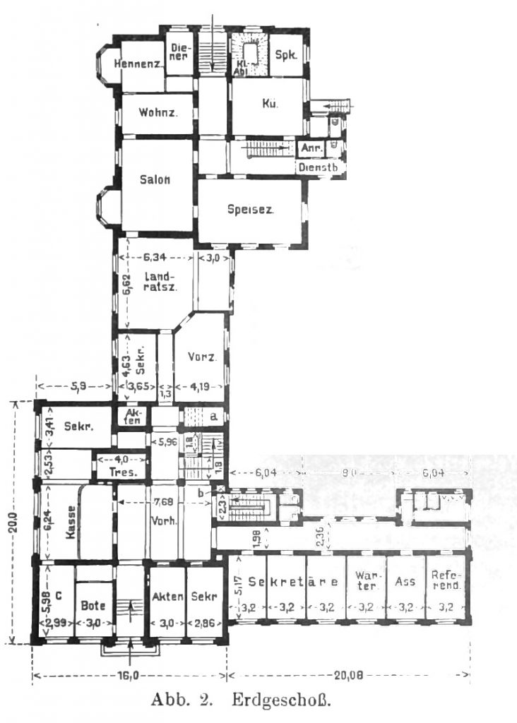 Im April 1906 wurde mit dem Neubau begonnen, der binnen Jahresfrist beendet war. Die Aufgabe umfaßte außer dem Bau des eigentlichen Landratsamtes die Umgestaltung des älteren Landratswohnhauses sowie den Bau einer Automobilhalle mit Werkstätte nebst kleiner Wohnung und die Herstellung der Umwehrung und der Gartenanlagen des großen Vorplatzes (Abb. 4).