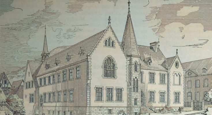 Weder eine überraschende architektonische Lösung, noch irgend welche technische Einzelheiten gaben Veranlassung zu diesen Mittheilungen. Aber die klare, ungekünstelte Anlage und die glückliche Einfügung des Gebäudes an der gewählten Stelle sind beachtenswerth. Es ist ausserdem ein in mittelalterlichen Formen und in echtem Material errichtetes Schulgebäude, eine seltene Erscheinung unter den kleineren Bauausführungen an den Ufern des mit alten mittelalterlichen Bauwerken besetzten Rheinstromes. Wo mehr als am Rhein erschrickt man über die zahlreichen gegipsten und geglätteten Haus- und Hotel-Fassaden mit ihrem Dutzendfenster-Axensystem.