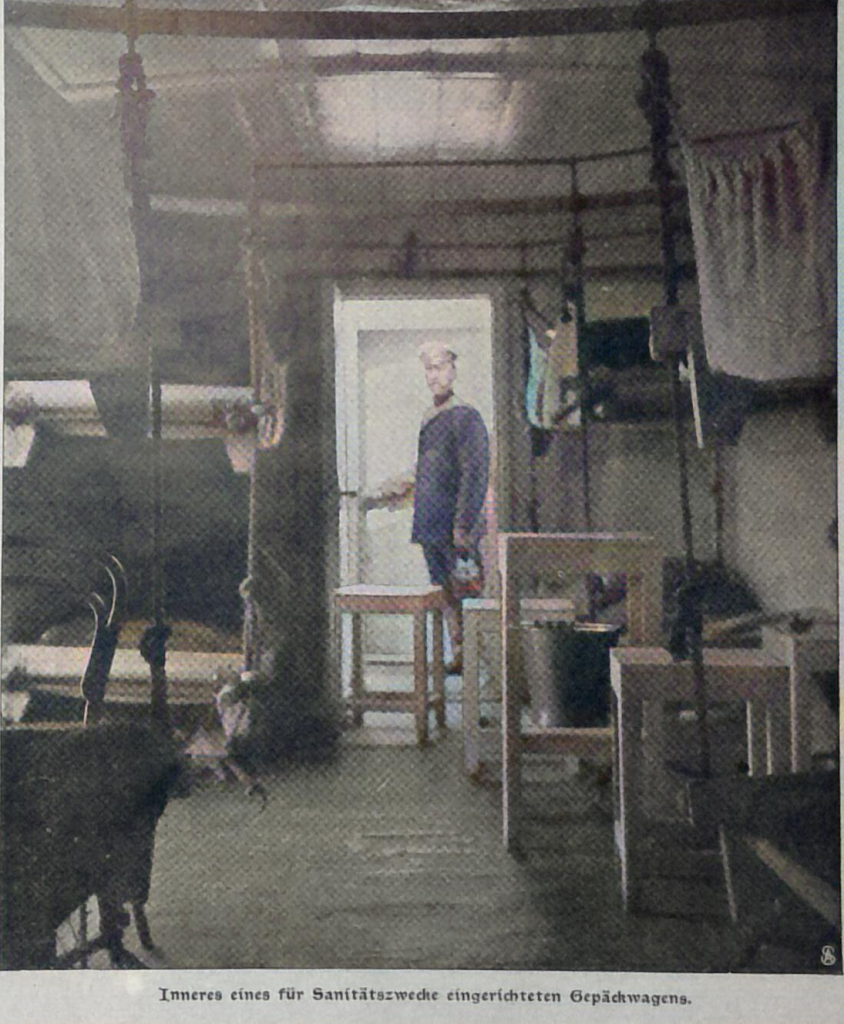Die Feldlazarette, jetzt bereits in großer Anzahl vorhanden, sind mit den neusten praktischen Erfindungen ausgestattet. Leicht transportable Zelte, leichte, doch bequeme Betten. Zwischen je zweien steht eine Kiste, die sich im Nu in einen Nachtisch verwandelt mit allem Zubehör sowie Wäsche und Verbandzeug. Ganz musterhaft ist n dieser Beziehung das „Evangelische Feldlazarett“, gestiftet von den evangelischen Gemeinden in Petersburg. In kürzester Zeit vollzog sich seine ganze Ausrüstung, so daß es schon seit mehreren Monaten segensreich im Feld tätig ist.
