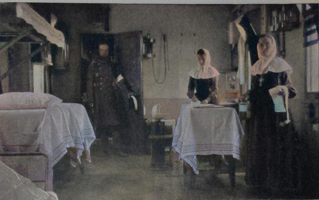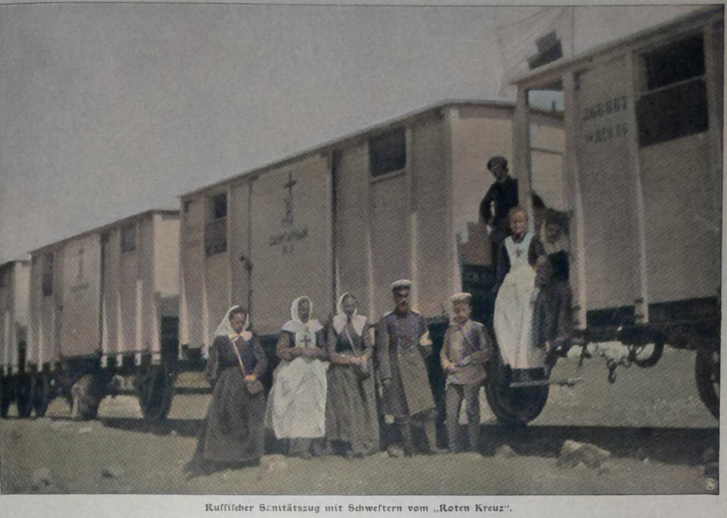 Unter den barmherzigen Schwestern gibt es fast nur Damen der intelligenten und priviligierten Stände. Keine scheut sich, die niedrigste Arbeit zu verrichten, wenn Bedienung nicht gleich zur Hand ist. Die einzige Tochter des Admirals Roschdschestwenski befindet sich auch unter den barmherzigen Schwestern, läuft selbst mit einem Wassereimer zum Brunnen und hat schon so manche Diele sauber gescheuert, wie sie stolz ihren Eltern berichtet. In Port Arthur arbeitete bis vor kurzem noch die Frau des Kommandeurs der „Diana“, Fürstin Lieven, in den Baracken und Hospitälern in der bescheidenen Tracht einer barmherzigen Schwester. Täglich führt der Schienenstrang neue Kräfte heran, denn alle halbwegs wohlhabenden Landschaften haben damit begonnen, ihre eigenen Hospitäler auf dem Kriegsschauplatz einzurichten. Die weiblichen Mitglieder des Zarenhauses haben eigene Sanitätszüge ausgerüstet. Sowohl die junge Zarin Alexandra Feodorowna wie die Zarinmutter Maria Feodorowna, ebenso die Großfürstin Wladimir, Maria Pawlowna. Die weißlackierten Waggons glichen in ihrem Innern musterhaften Hospitälern mit überraschendem Komfort: Apotheken, Badezimmer, Wohnräume für Aerzte und Sanitätspersonal, Küche – alles war vorhanden.