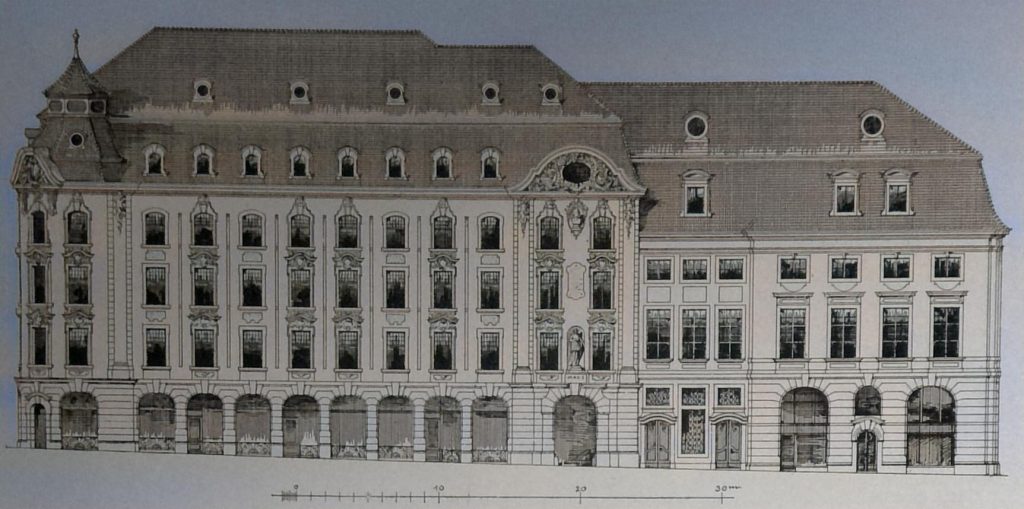 Der längs der Universitätsstrasse belegene Bau – im Erdgeschoss als städtisches Zeughaus benutzt – wurde in den Jahren 1780-83 vom Baudirektor Friedr. Dauthe im Obergeschoss zu einem Konzertsaale – dem berühmten alten Leipziger Gewandhaussaale – umgebaut. An der Ecke vom Neumarkte und dem Kupfergässchen befindet sich noch heute das ehemalige „Kramerhaus“. In dem im übrigen von Privathäusern eingeschlossenen Viertel stand ausserdem als ein sehr bescheidenes Hofgebäude, das königliche Konservatorium der Musik.