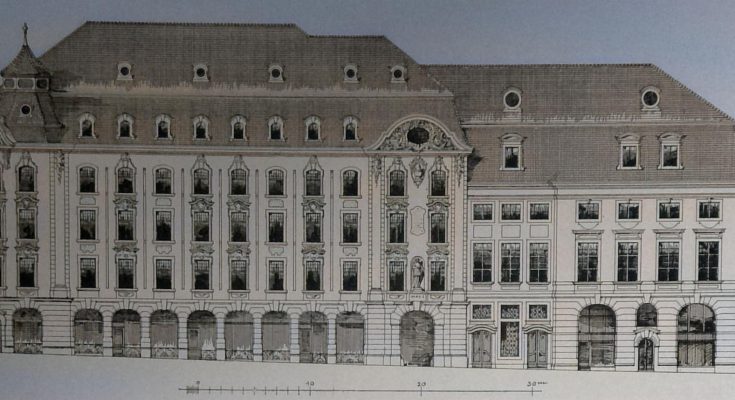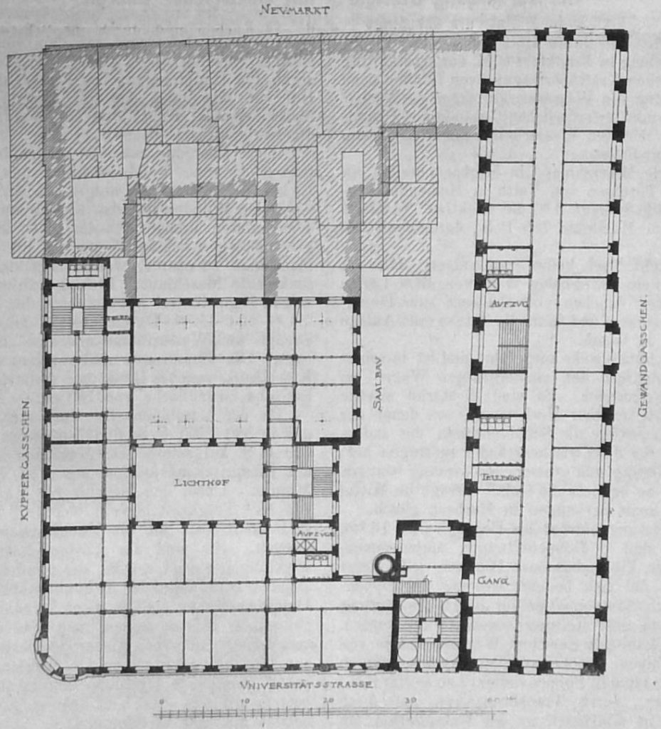 Der infrage kommende, etwa 3500 qm grosse, im Mittelpunkte der Altstadt Leipzig belegene Baublock ist von zwei belebten Strassenzügen, der Universitätsstrasse und dem Neumarkte, sowie rechtwinklig zu diesen von zwei Gassen, dem Kupfergässchen und dem Gewandhausgässchen, berenzt. Derselbe wurde bereits in der Mitte des 15. Jahrhunderts, als „die Kramkammern“ und sogenannten Bühnen im Erdgeschosse des Rathhauses dem erweiterten Bedürfnisse nicht mehr genügten, mit einem Gewandhause (Tuchhause) bebaut. In dem 76 m langen Hauptflügel desselben am Gewandhausgässchen fand nach verschiedenen baulichen Veränderungen im Jahre 1740 die Stadtbibliothek ihr Heim.