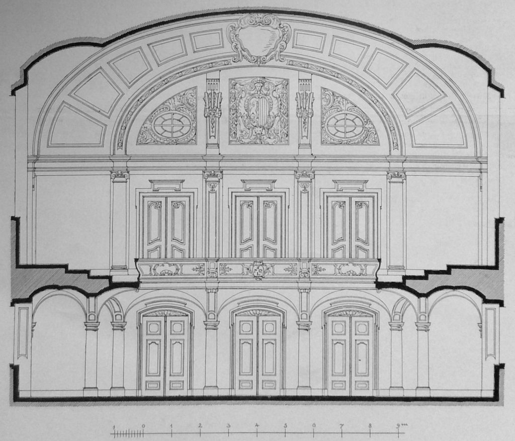 Beim Umbau der unteren Geschosse des Bibliothekflügels im Jahre 1894 blieb der im Hauptgeschoss gelegene Bibliotheksaal, das sogenannte „Corps“ unberührt. Das Erdgeschoss erhielt nunmehr 23 Messlokale mit zusammen 941 qm, das Zwischengeschoss 23 desgleichen mit zusammen 403 qm nutzbarer Fläche. Die zweckmässig eingerichteten, mit einer Dampf-Niederdruckheizung versehenen Räume fanden allseitig Beifall und wurden an auswärtige Firmen, meist keramischer Branche, vermiethet. Die werthvolle Büchersammlung wurde durch eine unter der Holzbalkenlage des Saales eingezogene Monierdecke gegen Feuersgefahr geschützt. Die Aufgabe des Architekten war es, das Aeussere des Gebäudes trotz der für die Läden nothwendigen Durchbrechung der Umfassungsmauern – massive Pfeiler mit Bogenöffnungen – nicht in seinem bisherigen monumentalen Charakter zu schädigen.