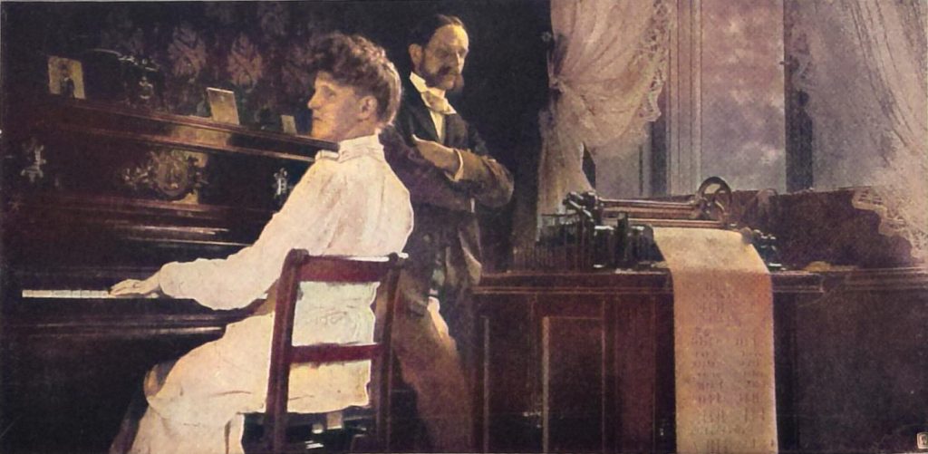 Die äußerst sinnreich konstruierte Aufnahmemaschine ist ein kleines Wunderwerk, das für gewöhnlich im eleganten Schrein verborgen arbeitet, das wir aber zur photographischen Aufnahme freilegten, gleich der elektrischen Wiederholungsvorrichtung am Klavier, die für gewöhnlich nicht sichtbar ist. Beide Vorrichtungen können mit jedem Piano oder Flügel in Verein gebracht werden.