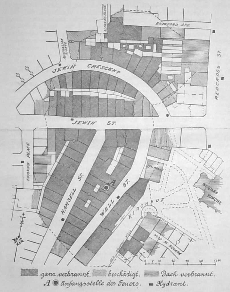 Durch diesen Umstand hatte das Feuer überall sofort starke Luftzuführung und konnte sich über die Lichthöfe der Grundstücke und über die schmalen Strassen hindurch rasch verbreiten. Wie gross die Gluth gewesen sein muss, geht daraus hervor, dass, trotzdem kein irgendwie erheblicher Wind herrschte, das Dach der mehr als 40 m vom Brandherde entfernten St. Giles Kirche mehrmals Feuer fing, so dass es Mühe kostete, dieselbe zu retten. Auch waren zahlreiche Geldschränke, welche später aus dem Schutt ausgegraben wurden, total ausgebrannt und werthlos geworden.