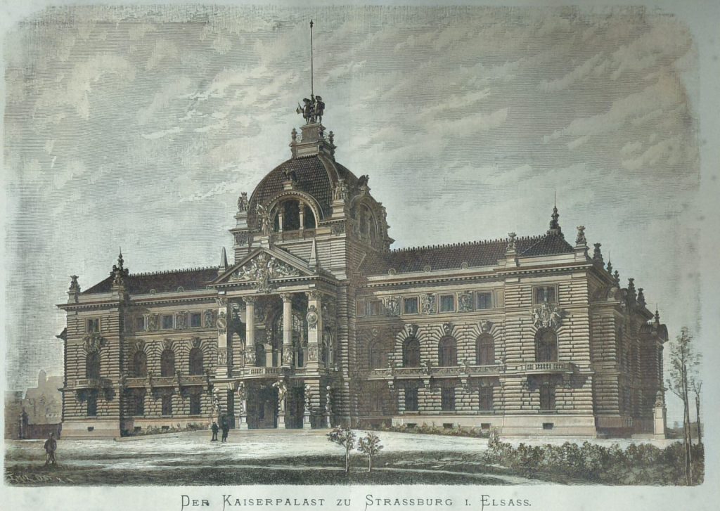 Schon bei den ersten Besuchen Kaiser Wilhelms I. in Strassburg stellte es sich heraus, dass eine angemessene, zugleich den Bedürfnissen der Hofhaltung entsprechende Unterbringung des Kaiserpaars, seiner Gäste und seines Gefolges, sowie nicht minder die Beschaffung der erforderlichen grossen Festräume nahezu unüberwindliche Schwierigkeiten mit sich bringe. Rücksichten auf die Würde des Reichs wiesen unmittelbar darauf hin, diesen Zuständen für die Zukunft dadurch ein Ende zu machen, dass man dem Kaiser auch in der Hauptstadt der Reichslande ein eigenes Heim begründe. So wurde denn von den betheiligten Behörden schon i. J. 1880 die Errichtung eines Kaiserpalastes zu Strassburg in Aussicht genommen, für welchen man die Baustelle auf der Westseite des in der Fortsetzung des Broglie anzulegenden grossen Platzes und eine Bausumme von 2 Millionen Mark bestimmte.