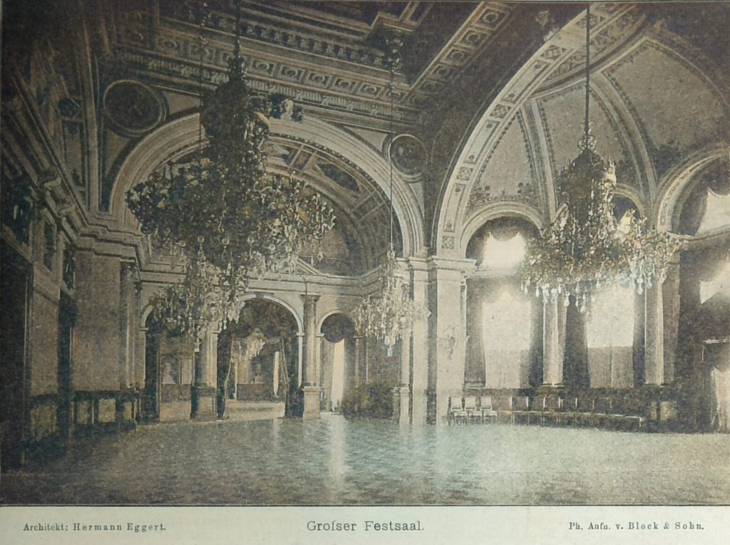 Sämmtliche Haupträume des Palastes sind in dem 6,0 m hohen I. Obergeschosse desselben vereinigt, reichen jedoch zu einem namhaften Theile noch in das darüber liegende Geschoss bezw. den Dachraum hinein. Nach hinten liegen hier die auf eine Gesellschaft von 350 Personen berechneten Festräume: in der Mitte der durch eine mächtige flachbogige Apsis nach aussen erweiterte Fest- und Tanzsaal, links der Speisesaal mit dem Anrichte-Z., rechts der Versammlungs-Saal mit dem Vorzimmer. Der durch eine Kuppel überdeckte Mittelbau der Vorderseite, an den sich über dem unteren Portikus eine offene Vorhalle mit Balkon schliefst, enthält den Audienzsaal der kaiserlichen Majestäten. Zu beiden Seiten desselben liegen in nahezu symmetrischer Anordnung, bis durch die Flügel reichend, die Wohnungen der Kaiserin und des Kaisers, umfassend je 1 Vor-, Empfangs-, Wohn- und Schlafzimmer mit den nöthigen Nebenräumen für Bad, Kleider, Kammerfrauen, Kavaliere usw.; die hintersten Räume an den Nebentreppen sind durch eine Zwischendecke getheilt und enthalten im Obergeschoss noch 1 Diener-Z. – An sich ist diese s. Z. von Kaiser Wilhelm I. gebilligte, strenge Scheidung der beiden Wohnungen des Kaiserpaares und die hotelartige Aufreihung der zu ihnen gehörigen Zimmer an Korridoren vielleicht ein angreifbarer Punkt der Grundrisslösung, die im übrigen mit strenger Beschränkung auf das Nothwendige überall Grossartigkeit der Raumentfaltung zu verbinden gewusst hat. Es hängt die bezgl. Anordnung jedoch mit dem ganzen System des Hauses so eng zusammen, dass sie wohl als unvermeidlich bezeichnet werden kann.