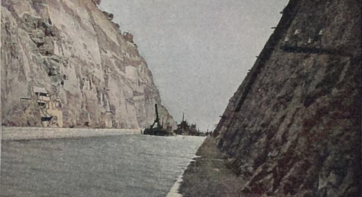 Der Kanal von Corinth, seit 2 ½ Jahren nach männichfachen Schicksalen beendet, ist trotz seiner geringen Länge von 6 km und trotz der Dürftigkeit des Verkehrs, den er zu bewältigen ins Leben gerufen sein wird, ein Werk hohen technischen Ranges, da die Landenge, welche er durchbricht, aus kompaktem Fels besteht und das niedrige Vorland an beiden Küsten nur von geringer Breite ist.