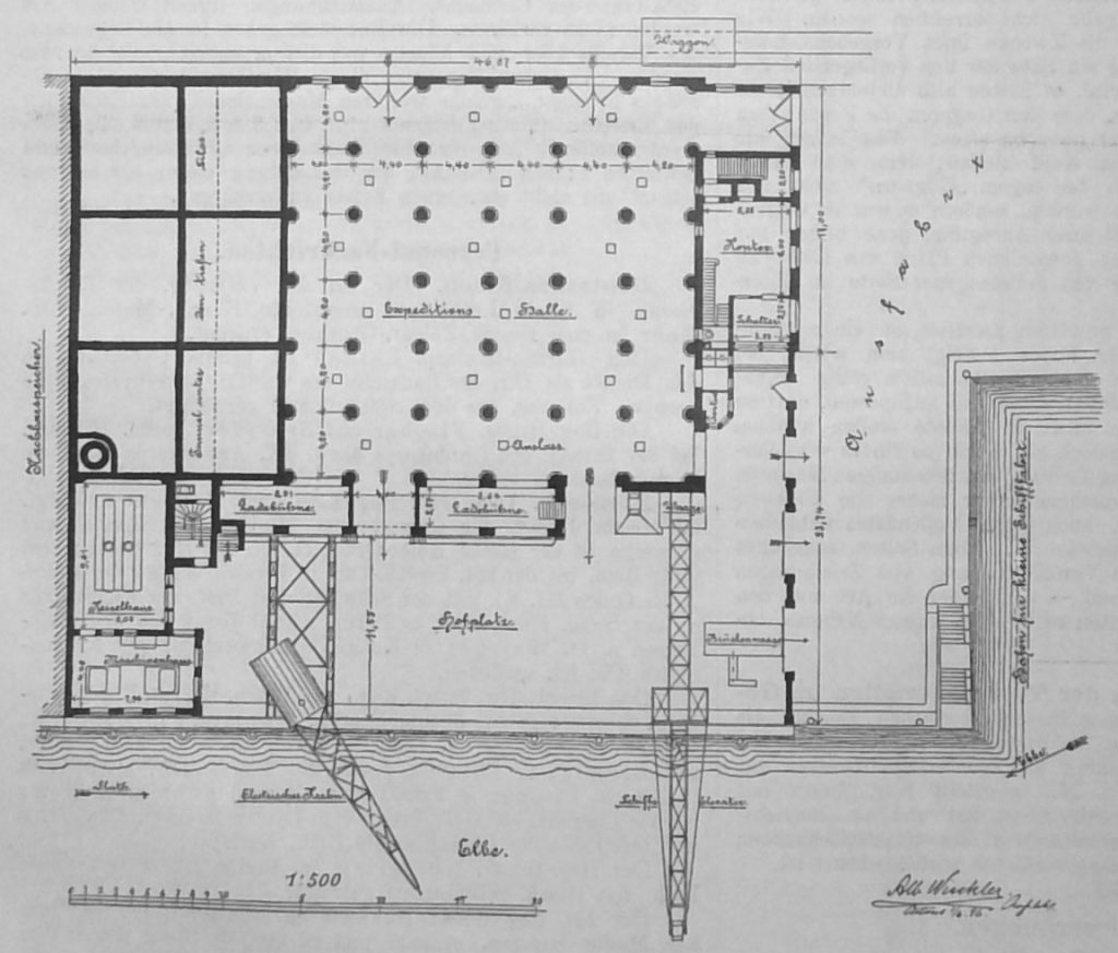Die Fundamente des Speichers führte der Bauübernehmer L. Völkers in Altona, die sämmtlichen Gebäude, einschliesslich der Eisenkonstruktionen und der Kaimauer, die Firma F. H. Schmidt in Altona aus.
