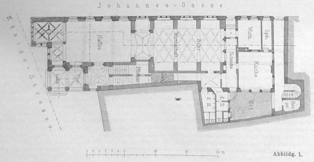 Das Haus wurde, weil es, wie Abbildg. 2 zeigt, in der Altstadt, und zwar an der Hauptverkehrsader, der unmittelbar zum Zentral-Bahnhof führenden Königsstrasse gelegen ist, in der alt-nürnberger Bauweise gehalten; für die des Stils war der Umstand maassgebend, dass von dem alten Hause, dessen Giebelfront allerdings später in den 50er Jahren in neugothischen Formen neu aufgeführt worden war, einige hübsche alte Stücke aus dem Jahre 1522 gut erhalten waren. Da es ein altes, geschichtlich bemerkenswerthes Haus war, so wollte der Architekt gerne diese alten Theile (ein Chörlein und ein Madonnenbild von Stein) wieder verwenden. Daher der Stil dieser Zeit (Abbildg. 3.) Die Kaiserfigur in der Mitte des Giebels stellt den Kaiser Ludwig den Baier dar. Die beiden Hauptseiten nach der Königsstrasse sind in dem rothen Nürnberger Sandstein ausgeführt; die nach der Johannisgasse gelegene, sowie die Hofseiten zeigen nur Fenstergewände, Sockel und Hauptgesims und einige kleinere Mauerflächen von Haustein; die übrigen Flächen sind in Backstein aufgeführt und verputzt. Die Gewölbe im Wirthschaftsaale sind alle echt, die Rippen und Bögen von Tretzendorfer weissem Sandstein, die Gewölbefelder von Backstein mit Verputz.