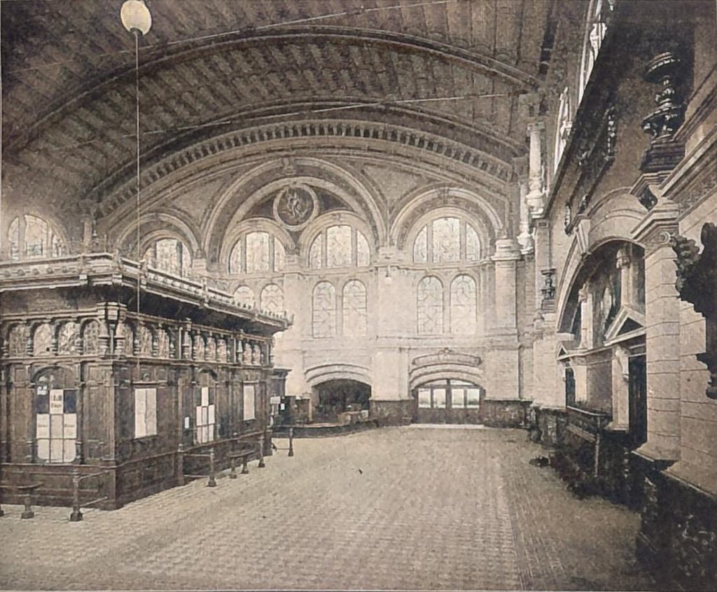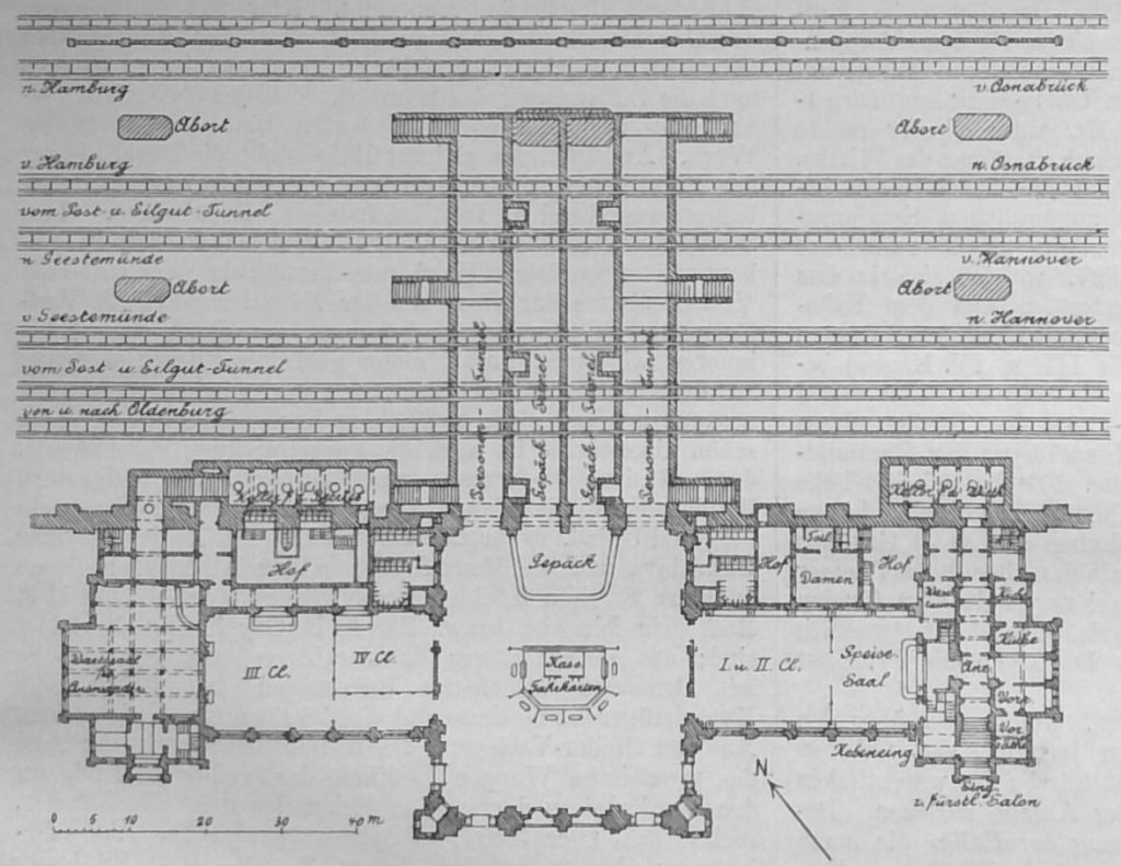 Die Grundriss-Anordnung des neuen Bahnhofs, dessen Höhenlage selbstverständlich so gewählt worden ist, dass die früher mit der Eisenbahn in der Gleiche sich kreuzenden Strassen unter derselben durchgeführt werden konnten, entspricht im Hauptgedanken derjenigen, die zuerst beim Bahnhof Hannover angewendet und erprobt worden ist. An den Bahnkörper schliefst sich stadtseitig in der Mitte der ganzen Anlage eine mächtige Vorhalle von 32,0 m Breite, 86,5 m Tiefe und 23,76 m Scheitelhöhe, von aussen zugänglich durch 4 Doppelthore an den Enden der Front bezw. den vorspringenden Seiten. Aus dieser Halle entspringen an der Rückseite 4 Tunnels, von denen die beiden seitlichen den Aufgang der Reisenden zu den Perrons vermitteln, während die beiden mittleren zur Beförderung des Gepäcks nach bezw. von den Zügen dienen. Unmittelbar vor ihnen liegt die Gepäck-Aufgabe bezw. Abgabe, in der Mitte der Halle als ein kleiner Freibau die Fahrkarten-Ausgabe. In der Queraxe der Halle entspringen aus dieser die, je durch 2 Thüren zugänglichen beiden Wartesäle für die Reisenden der III. und IV. bezw. I. und II. Wagenklasse.