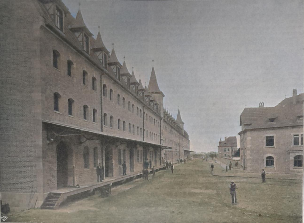 Der Rest kam auf Tiefbauten, als: Auffüllung des ganzen Hofes, Strassenkosten, Gehsteige, Gas- und Wasserleitung auf dem Hofe einschl. Kandelaber und Hydranten, Einfriedigungen usw. und Bauleitung.
