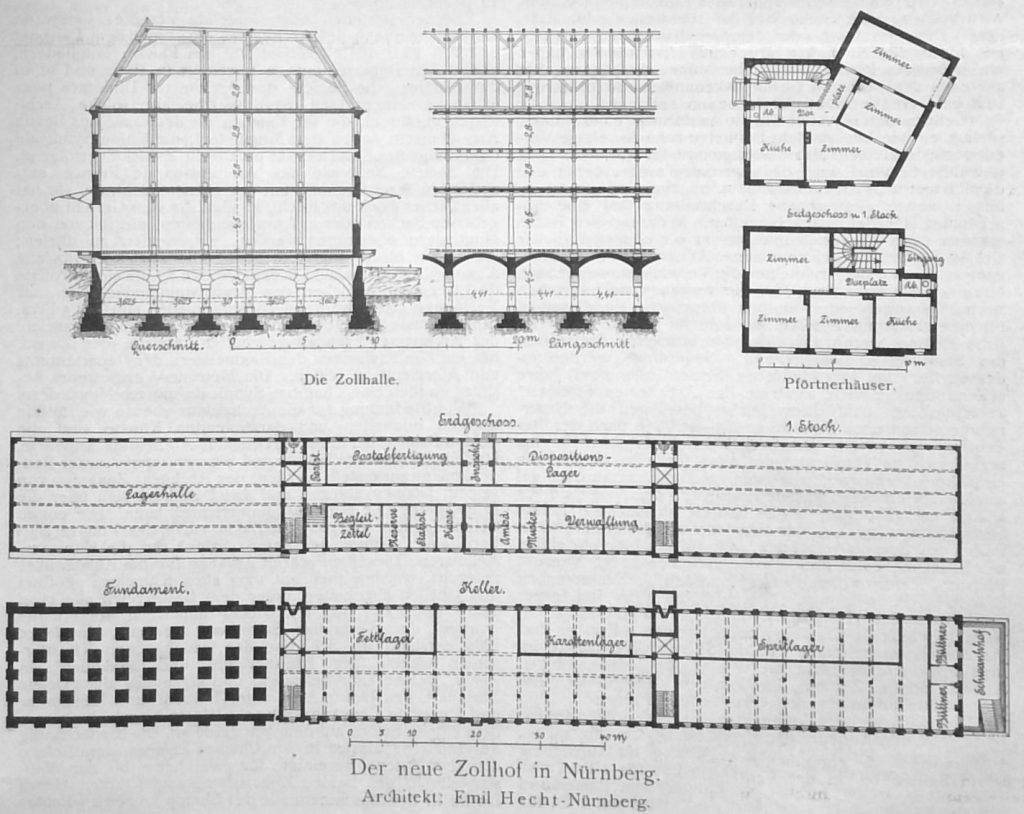 Der neue Zollhof in Nürnberg, Langs- und Querschnitt der Zollhalle, Grundriss der Pförtnerhäuser und der Zollhalle.