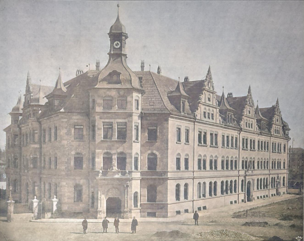 Die Ausführung erfolgte bis zum ersten Stock in röthlichem Keupersandstein, von da ab in Backsteinfugenbau mit Verwendung von Sandstein für die Architekturtheile. Zum Backsteinmauerwerk wurden keine Verblender sondern Maschinensteine verwendet und die Fugen mit weissem Mörtel ausgestrichen, was mit dem röthlichen grobkörnigen Sandstein eine harmonische Farbenwirkung giebt und den harten knalligen Eindruck, den der Gegensatz der Verblender zum Sandstein sonst aufweist, vermeidet.