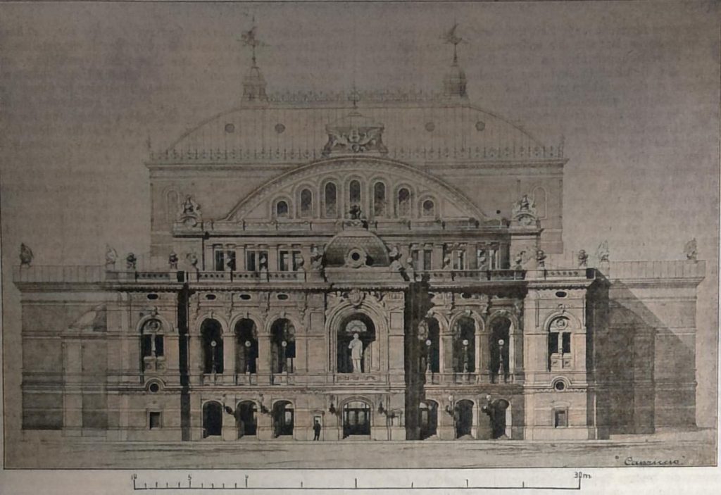Dieselbe rührt, wie schon berichtet wurde, von dem Geh. Staatsrath Prof. Victor Schroeter in St. Petersburg her, dem bereits eine Reihe von trefflichen Theaterbauten in Russland ihre Entstehung verdanken und dem es hoffentlich in nicht zu ferner Zeit beschieden sein wird, auch seinen grossartigen Entwurf, für eine neue Oper in der russischen Hauptstadt zur Ausführung zu bringen. Für den mit den Leistungen des neueren Theaterbaues auch nur oberflächlich Vertrauten bedarf es in der That auch Dur eines Blicks auf den Entwurf, um in ihm das Werk eines Fachmannes von reifster Erfahrung und voller Sicherheit des Schaffens zu erkennen.