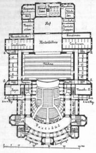Der Zuschauerraum fasst i. g. 1500 Personen (500 im Parkett, 166 i. Parterre, 50 i. d. Parterre- und 34 i. d. unteren Proszeniums-Logen, 152 i. d. 29 Logen des I. Ranges, 150 i. d. 30 Logen d. II. Ranges. 280 i. III. Range und 384 i. IV. Range). Die Sitze sind zu 0,53 m Br. Und 0,98 m Tiefe angenommen; Klappsitze sind ausgeschlossen. Für Kleiderablagen und Nebenräume ist in jedem Range reichlich gesorgt. Zweckmässig ist die im Programm vorgesehene Anordnung, dass das Foyer zugleich als Logenverbindungsgang dient. Für den Eintritt des Publikums in das Theater dienen 9 Zugänge und 6 Treppen; dem Vestibül und Foyer legen nach aussen offene Hallen sich vor. Das 80 qm grosse Orchester ist auf 70 Musiker berechnet.