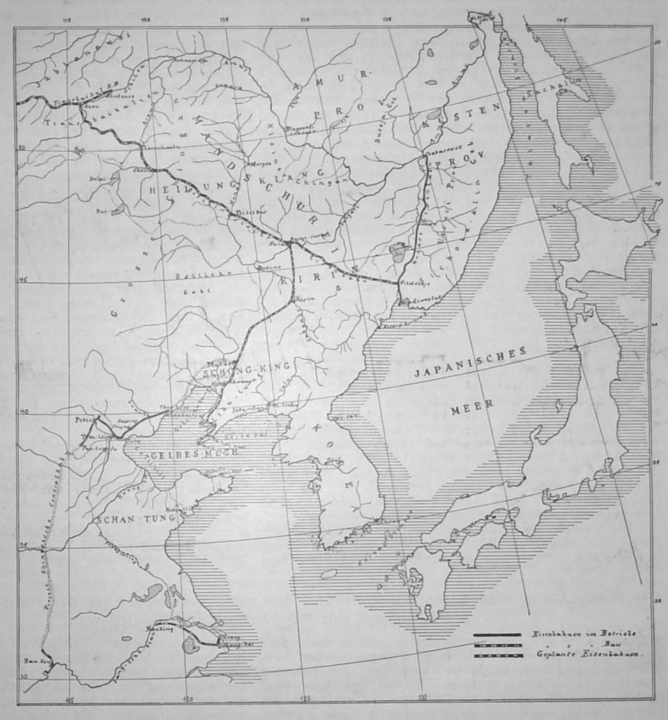 Gleichzeitig erwarb Russland das Recht, die genannten Häfen durch eine Bahn an der Westküste der Halbinsel Liau-tung, über Niutschwang, Mukden und Kirin, mit einer Station der zur Zeit im Bau begriffenen chinesischen Ostbahn (Als Ausgangspunkt für die Verbindungsbahn mit Port Arthur und Ta-lien-wan ist die Station Hulantschen (auch Hulan) der sibirisch-ostchinesischen Einsenbahn vorgeschlagen.) zu verbinden, in den grösseren Städten der Mandschurei Handelsniederlassungen und in den mineralreichen Gebieten Bergwerks-Unternehmungen zu begründen. Nach den zwischen der chinesischen Regierung und der russisch-chinesischen Bank am 27. Aug./8. Sept. 1896 getroffenen Vereinbarungen wird die chinesische Ostbahn, im Anschluss an die Transbaikal- und Süd-Ussuri-Eisenbahn, von der Westgrenze der Provinz Hei-lung-kiang nach der Ostgrenze der Provinz Kirin, von russischen Ingenieuren nach der Normalspur der sibirischen Eisenbahn gebaut, unter Oberaufsicht des russischen Finanzministeriums gestellt und von chinesischen und russischen Beamten verwaltet. Durch Vertragsbestimmungen sind Russland im Bau und Betriebe der chinesischen Ostbahn aussergewöhnliche Vorrechte eingeräumt, die nach Inbetriebsetzung der Bahn allmählich erweitert werden und die sog. chinesische Ostbahn thatsächlich in eine russische umgestalten dürften. Es unterliegt keinem Zweifel, dass die genannten chinesischen Häfen nach Ablauf des Pachtvertrages endgiltig in russischen Besitz übergehen werden, weil alle Bestrebungen Russlands dahin gerichtet sind, das grosse Gebiet der Mandschurei durch Handelsniederlassungen, Bergwerksunternehmungen und Bahnbauten allmählich zu russifiziren. In Kirin, dem Zentrum der östlichen Mandschurei, ist im Einverständniss mit China eine russische Garnison errichtet, die russisch-chinesische Bank hat in Port Arthur eine Handelsniederlassung eröffnet und steht im Begriff, auch in den grösseren Städten der Mandschurei ähnliche Unternehmungen zu gründen.