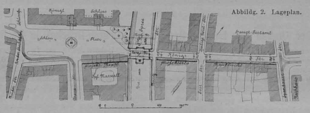 Dieser Entwurf erhielt, obschon er in gemeinsamen Berathungen der betheiligten Behörden in seinen Hauptzügen festgesetzt war, die Genehmigung des Hrn. Ministers der öffentlichen Arbeiten nicht, und zwar wurde die Ablehnung damit begründet, dass der Entwurf nicht genügende Rücksicht auf den Land- und Wasserverkehr nehme. Die schiefe Lage zum Stromstrich bereite der Schiffahrt Hindernisse und für den Landverkehr sei die Zufahrt vom Schlossplatz zur Brücke mit Rücksicht auf die weit vorspringenden Häuser zwischen Breitestrasse und Spree in gefährlicher Weise beengt. Dieser Zustand habe sich besonders seit Aufstellung des Schlossbrunnens unangenehm fühlbar gemacht, da sich zwischen diesem und dem südlichen Bürgersteige des Schlossplatzes ein gefährlicher Engpass gebildet habe (vergl. den Lageplan Abbildg. 2). Durch den vorgelegten Entwurf werde der jetzige Zustand gleichsam verewigt werden.