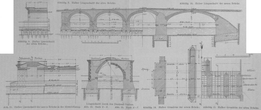 Massive Sandsteingewölbe in Korbbogenform von 60-70 cm Stärke überspannten die Durchfahrts-Oeffnungen. Die Form der tragenden Gewölbe trat in der Ansicht jedoch nicht in die Erscheinung. Es waren vielmehr der Brücke beiderseits in einer Stärke von 0,45 m besondere, schön geformte Stirnbögen stumpf vorgelegt, deren Scheitel erheblich tiefer lagen, als die der Gewölbe (vergl. Abbildg. 8 und 9). Die beiden mittleren Oeffnungen hatten daher nur 2,48 m, die Seitenöffnungen sogar nur 2,02 m Lichthöhe über dem jetzigen Hochwasserstande. Die Stirnbögen waren unter sich mit hochkantig gestellten Flachschienen verankert,welche in voller Brückenbreite hindurchgriffen. Die Breite der tragenden Gewölbe betrug nur 10,90 m, Der Mittelöffnung der Brücke war die 8,16 m vorspringende Denkmals-Plattform vorgelagert, welche von einem Halbkreisgewölbe getragen wurde. Die beiden, vor der Brückenfront vorspringenden Pfeiler waren dabei einander soweit genähert, dass nur eine Lichtweite von 5,66 m verblieb (Abbildg. 9 u. 15). Das tragende Gewölbe stiess stumpf an das Brückengewölbe und lag mit seinem Scheitel etwa in gleicher Höhe mit letzterem. Im Längenprofile zeigte die Brücke über den beiden äusseren Strompfeilern einen scharfen Knick. Das Hauptgesims des ganzen mittleren Theiles lag wagrecht, während die beiden Enden stark nach dem Ufer abfielen.