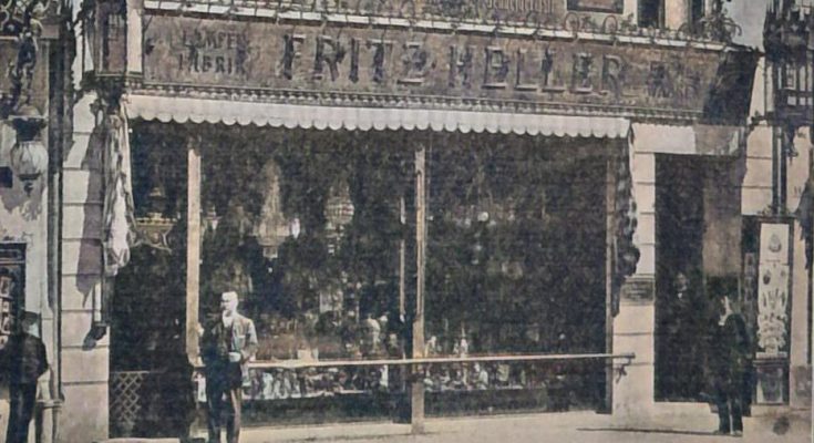 Dasselbe, Eigenthum der 22 Jahre bestehenden Firma Fritz Heller, Lampenfabrik und Bronzewaaren-Lager, stammt aus den 60er Jahren und war so wohl erhalten, dass es möglich war, den Forderungen des Geschäftsbetriebes nach Anlage eines geräumigen, mit Ausnahme des nothwendigen Hauseingangs die ganze Breite der Fassade und das ganze Erdgeschoss einnehmenden Ladens zu erfüllen, ohne das alte Gebäude abzutragen. Der Umbau des letzteren war nicht einmal ein durchgreifender, sondern er erstreckte sich auf das unbedingt Nothwendige. So blieb neben den oberen Geschossen das System der Lichtöffnungen der Fassade über dem Erdgeschoss erhalten und in der künstlerischen Erfüllung der Forderungen einer Geschäftsreklame im besseren Sinne des Wortes in der Fassadengestaltung aufgrund der gegebenen Verhältnisse liegt die eigenartige Bedeutung der Aufgabe, die uns veranlasst, ihre Lösung unseren Lesern vorzuführen.