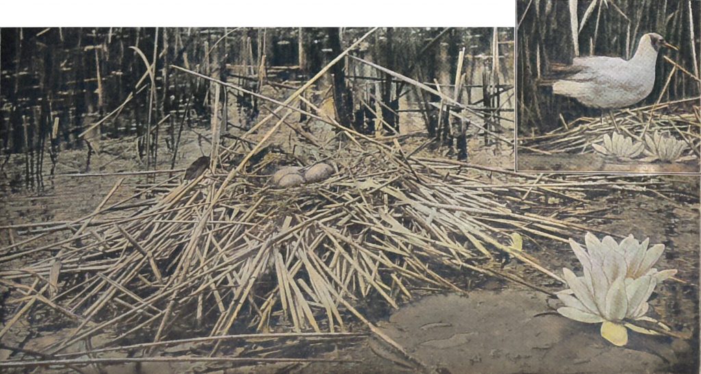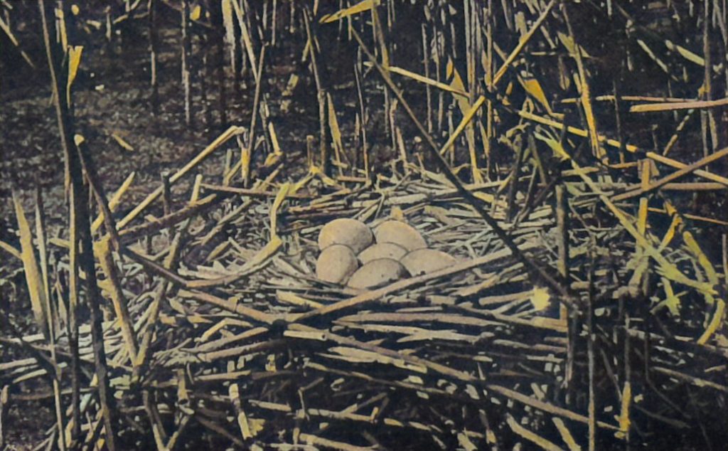 Abb. 2 zeigt uns das Nest mit Eiern desselben Vogels in einem Rohrwald auf ebener Erde.