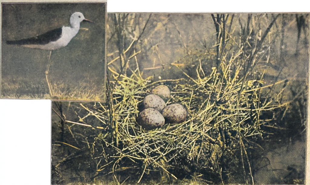 Mehr auf dem Trockenen im Gras steht das Nest des überaus hochbeinigen Strandreiters (Abb. 3), eines etwa schnepfengroßen Vogels, der uns bei unserm Nähertreten in weiten Kreisen ängstlich rufend umschwärmt. Lange müssen wir suchen, um das Nest zu finden, ja es kann vorkommen, daß wir hineintreten, ohne es zu merken. Nicht etwa weil es so versteckt angelegt ist, keineswegs, ganz offen liegen die Eier auf der Erde, aber ihre Farbe, die etwa an die der Kiebitzeier erinnert, geht so in das Muster der Umgebung über, daß viele Uebung dazu gehört, um sie aufzufinden. Nach etwa dreiwöchentlicher Bebrütung entschlüpfen die Jungen, die ihren Eltern sofort auf der Erde ezu folgen imstande sind.