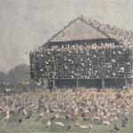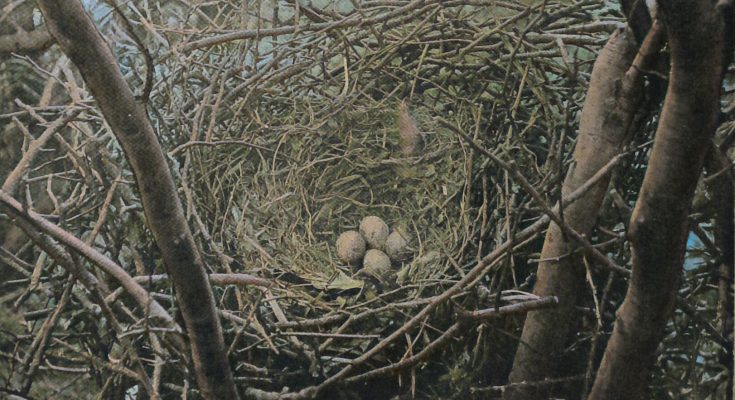 Auf dem Heimweg treffen wir noch eine ähnliche Scenerie an wie die Möweninsel, nur ist alles vertauscht. Die Vögel sind nicht wie vorhin weiß, sondern schwarz, und die Nester stehen nicht unter, sondern über uns. Schon von weitem durch den dichten Saatkrähenschwarm mit seinem tausendstimmigen „Kia“ und „Krah“ angezogen, gelangen wir in einen hochstämmigen Buchenwald, bei dessen Betreten sich über uns ein ungeheurer Aufruhr erhebt, der sich verdoppelt, als wir es wagen, mit den angeschnallten Steigeisen einen Stamm zu erklimmen und das Innere eines Nestes zu besichtigen. (Abb. 5, 6 und 7) Auch hier steht Nest an Nest, auf einem Baum oft über ein Dutzend; auch hier benutzt der Mensch die Eier, freilich meist unter falscher Flagge: sie werden häufig als Kiebizeier verkauft, denen sie entfernt ähneln.