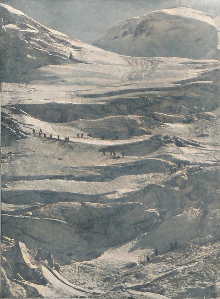 Viel gefährlicher sind im allgemeinen große Gletschertouren, insofern die Gefahren der Gletscher viel weniger den Charakter des subjektiven tragen als die Abstürze in den Felsen. Ein Gletscher ist immer ein tückischer Geselle. Versteckt er in seinen tieferen Partien seine Spalten unter einer trügerischen Schneedecke, so bietet er in seinen oberen steileren Partien tückische Eishänge, auf denen mitunter eine lose, leichtabrutschende und den Wanderer mit sich reißende Schneeschicht aufsitzt. So drohen auch dem guten Bergsteiger immerhin einige Gefahren auf Gletschertouren, indessen sind sie auch im weitesten Maß abhängig von der Persönlichkeit des Bergsteigers, und zwar besonders in Bezug auf ihre Vermeidung. Der erprobte Bergsteiger wird die Gefahren viel besser erkennen als der ungeübte und, die Gefahr richtig erkannt haben, heißt sie schon beinah vermieden haben.