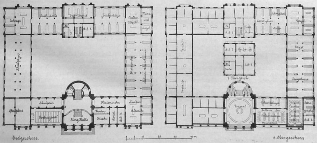 Für die fernere Beurtheilung wurde als maassgebend festgesetzt, dass denn doch der Satz von 18 M. auf 1 cbm umbauten Raumes, ohne besondere Berechnung der Fundamente, nicht unterschritten werden dürfe. Für die Gemäldekabinette sollte, wenn auch reines Nordlicht nicht durchweg zu ermöglichen wäre, doch Südlicht jedenfalls ausgeschlossen sein. Zu grosse Raumtiefen sollten für die natur- und kulturhistorischen Sammlungen nicht zugelassen werden. Vorspringende Bautheile, welche unangenehme Reflexlichter hervorbringen und knapp bemessene Innenhöfe, welche den vollen Lichteinfall beeinträchtigen, wurden als unerwünscht bezeichnet. Monumentale Gestaltung des Aeusseren, des Vestibüls und des Treppenhauses sollte gefordert werden. Die Aneinanderreihung der Innenräume sollte eine Klare und übersichtliche sein und der Ein- und Ausgang der Besucher durch ein einziges Hauptportal unter Ueberwachung gehalten werden können.
