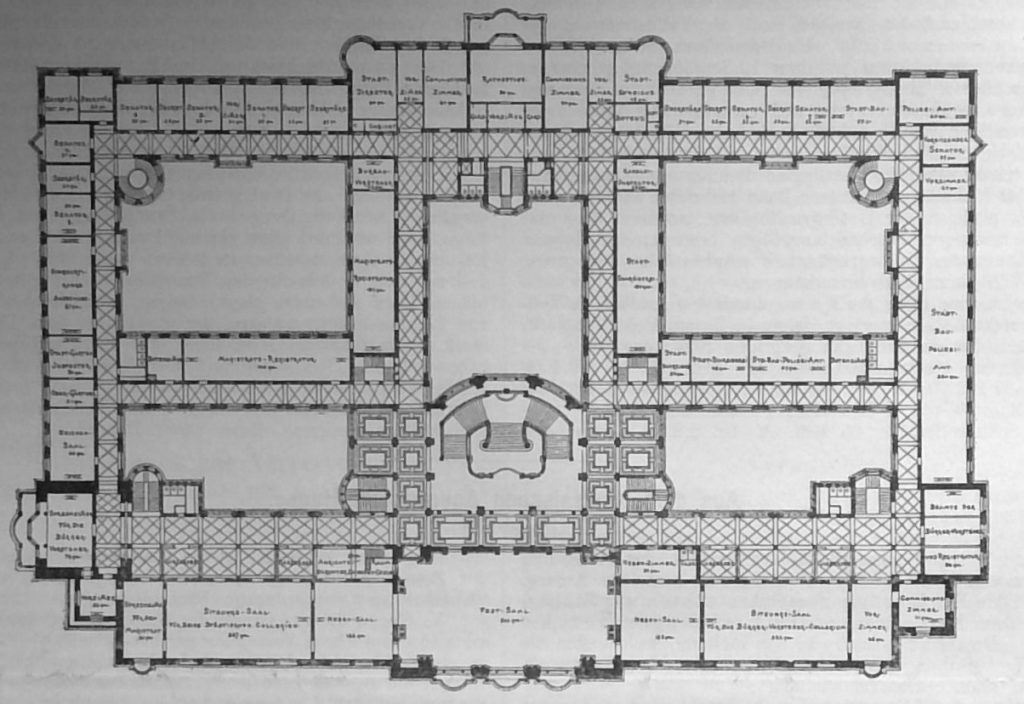 Wesentlich verschieden von den hier besprochenen Grundrissen ist der des Entwurfes mit dem Zeichen des gestielten Kleeblattes des Hrn. Geh. Brth. H. Eggert-Berlin und zwar infolge der Zusammenlegung sämmtlicher Räume in einem Gebäude. Aus dem grossen Ausmaass des verlangten Flächenraumes ergiebt sich zunächst die Gruppirung der Anlage um 5 grosse Höfe. Festsäle und Sitzungsräume sind in stattlicher Front gegen die Friedrichstrasse gelegt und durch eine Treppe von grosser Anlage zugänglich gemacht. Ein mächtiger Thurm ist an die östliche Ecke des Bauwerks verlegt und beherrscht dessen fein empfundenen Aufbau. Auch bei diesem Grundriss ist kaum eine grössere Konzentration der Haupträume möglich. Die Höfe geben durch Treppenausbauten usw. Anlass zu interessanter künstlerischer Ausbildung. Ob es zweckmässig ist, die Räume für den Stadtdirektor, den Stadtsyndikus, die Rathsstube und die Kommissionszimmer so weit vom Haupteingange ab zu legen, wie hier, das hängt von lokaler Gewohnheit ab.