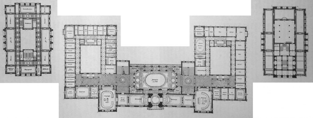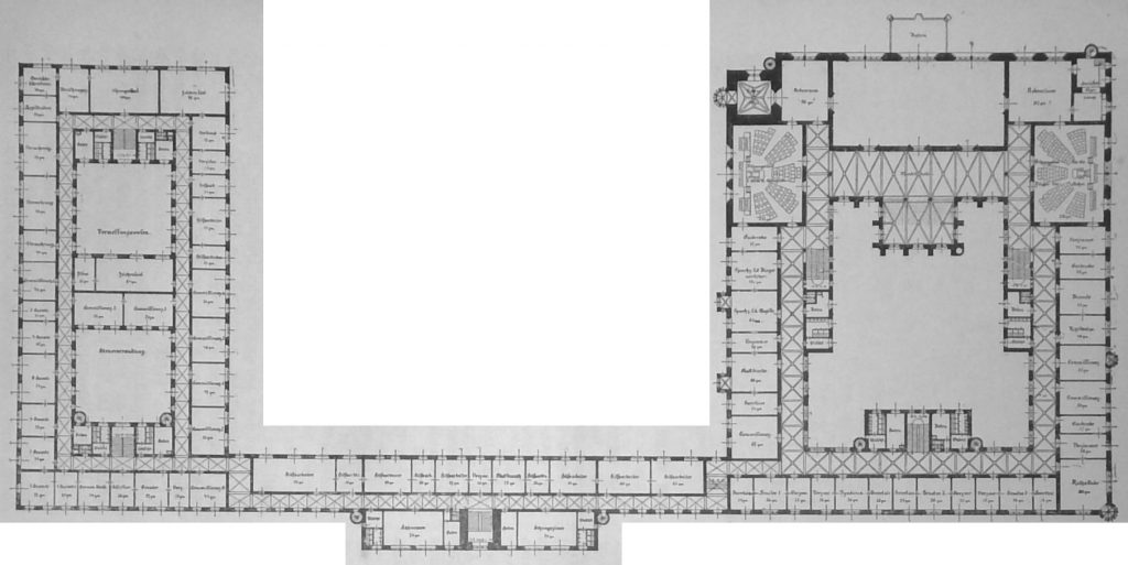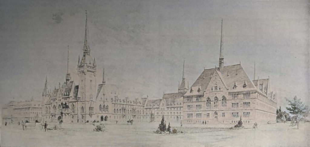 Nur einer Variante sei noch gedacht. Es ist die in dem Entwurf von H. Fittschen in Hamburg. In diesem Entwurfe wird das um 2 grosse und 2 kleine Höfe gruppirte Rathhaus mit seiner Vorderfront nahezu in die hintere Flucht des Kestner-Museums gerückt, mit diesem verbunden und rechts vom Museum ein weiteres Bauwerk angeordnet, das in der Längsaxe der Verbindungsgallerien liegt.